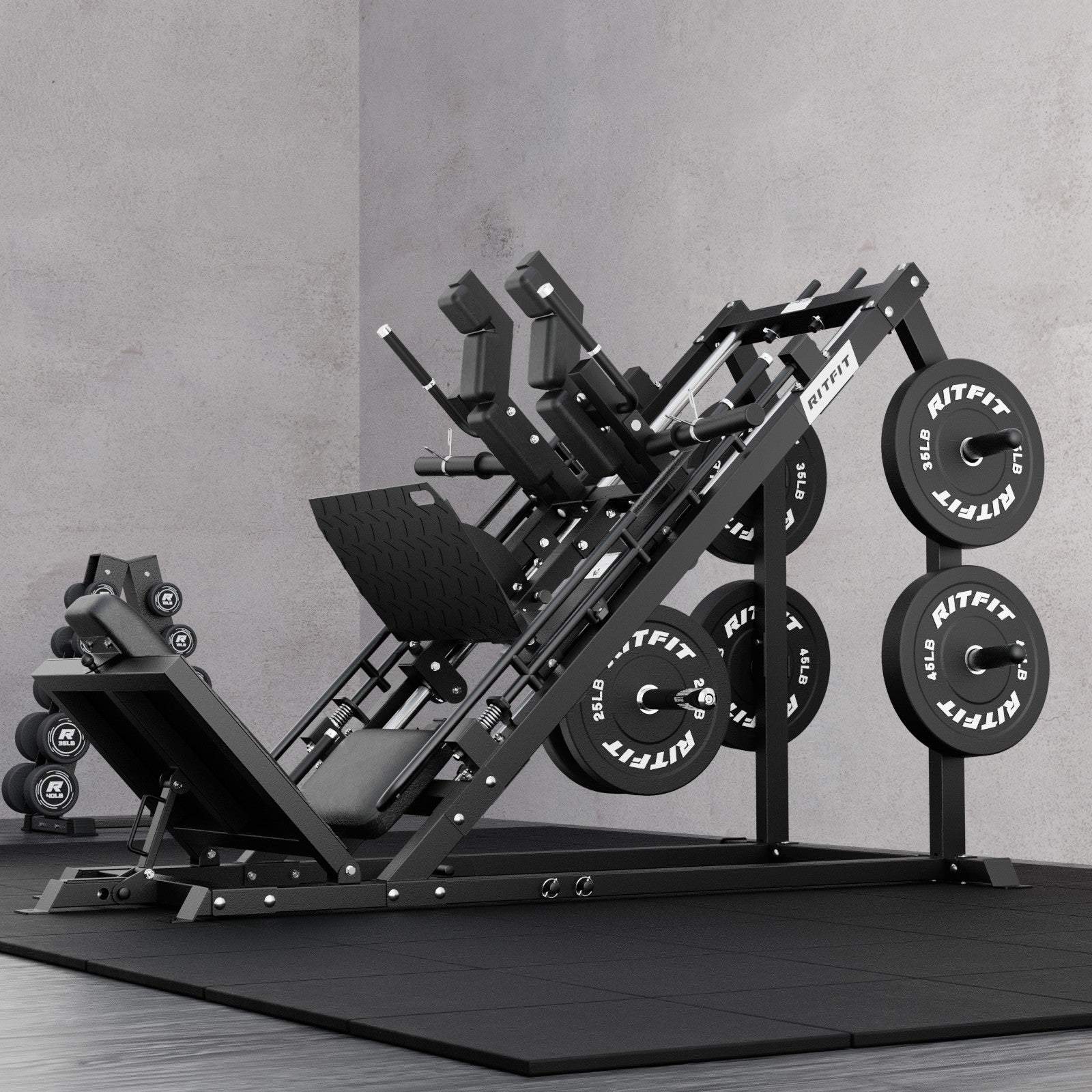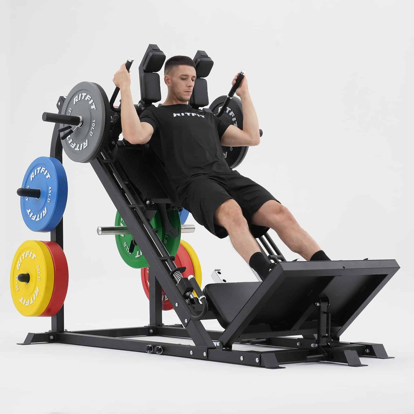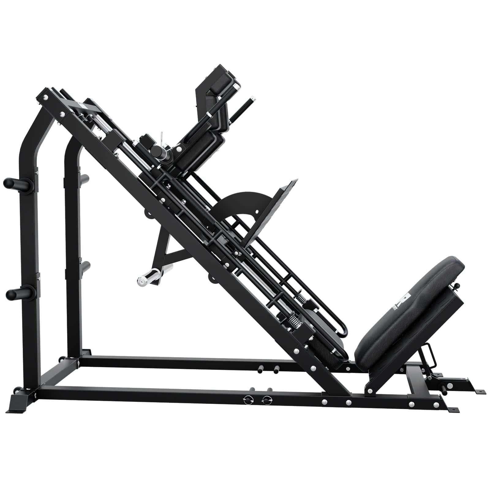 Crafted from high-tensile steel, this machine features adjustable angles for hack squats and leg presses, accommodating users from 4 ft 9” to 6 ft 8”.