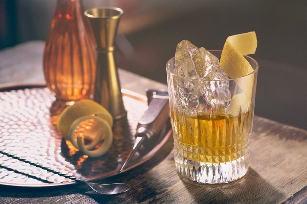 Combine rye whiskey with a dash or two of bitters, sugar syrup, and ice, then strain into a rock glass that has been rinsed with absinthe. It packs a punch and is garnished with a twist of lemon zest.