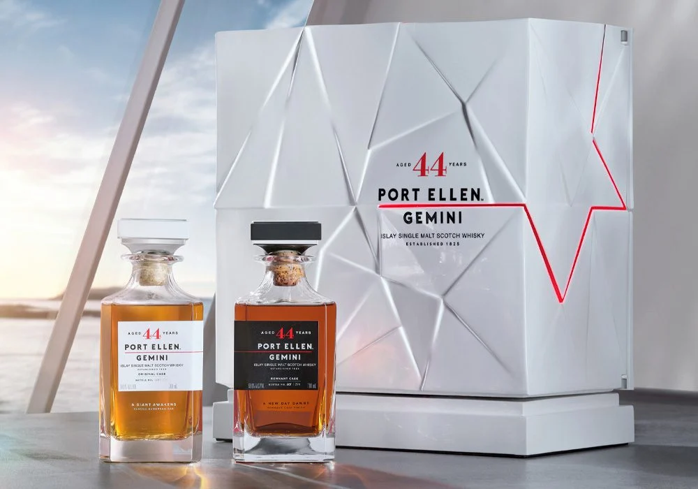 The Port Ellen Gemini release features two whiskies—Original and Remnant—distilled in 1978 and bottled at 44 years of age. Presented in exquisite crystal decanters and housed within a mirrored casket, these exceptional single malts are available only as a set, and come with a price tag of £45,000.