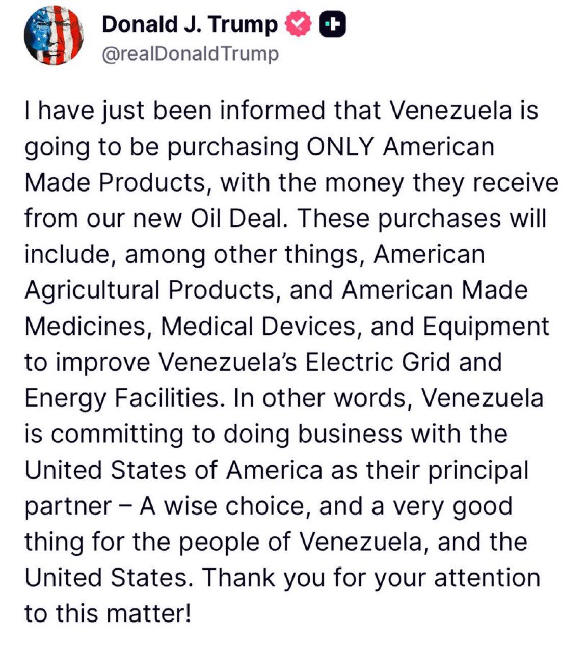 As Trump articulated, “Venezuela must commit to doing business with the United States as their principal partner—a wise choice for the Venezuelan people and for the U.S.”