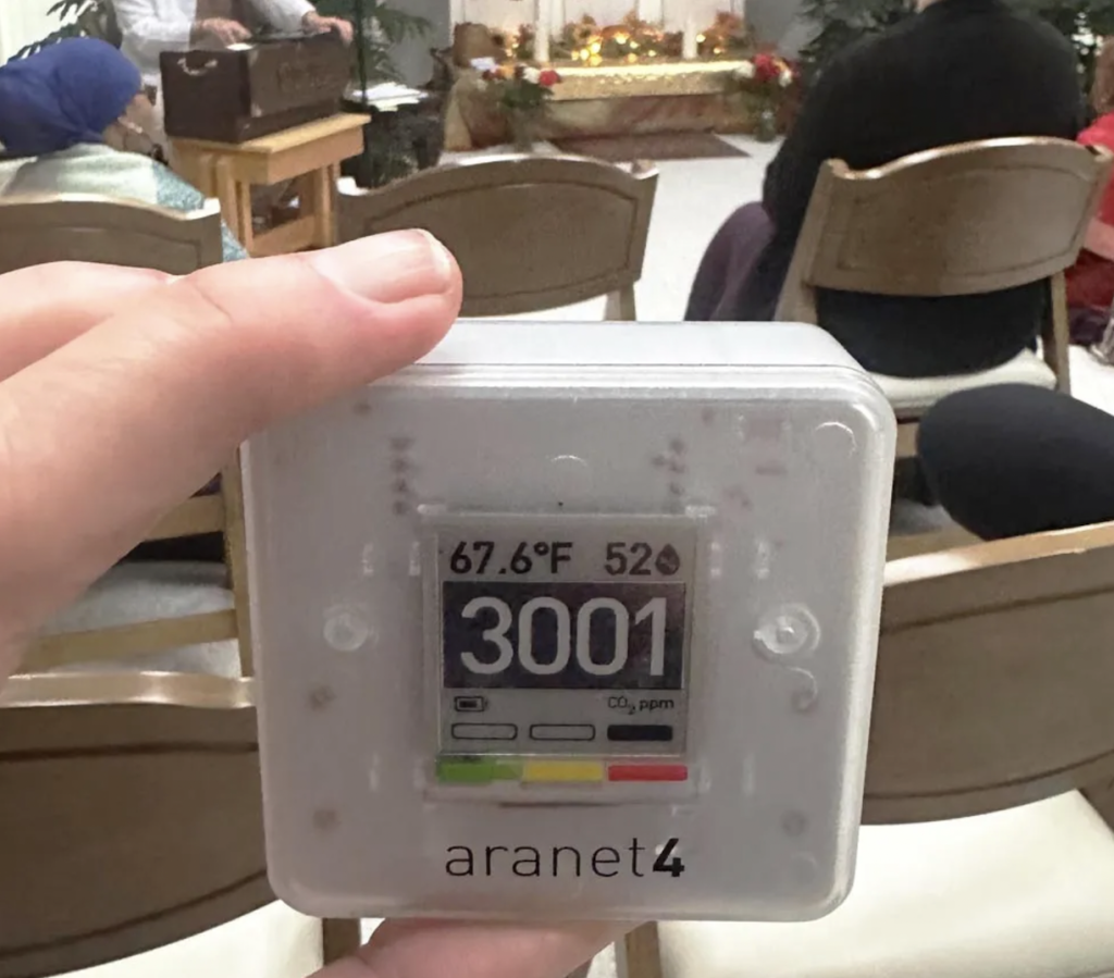 Figure 2. I measured a CO2 concentration of 3,001 ppm in this church – a level high enough to cause headaches and significant spread of respiratory illnesses. The church was running one HEPA unit with a clean air delivery rate of about 100 cubic feet per second. According to ASHRAE Standard 241-2023, a CADR of 3,600 cubic ft/s would be required for adequate infection control in a room with that level of CO2 and 35 people singing. This implies the need for an additional 35 HEPA units or four large four-filter Corsi-Rosenthal boxes (though the noise would be considerable). However, this additional HEPA filtration would not reduce the CO2 level. The church’s ventilation system needs upgrading.