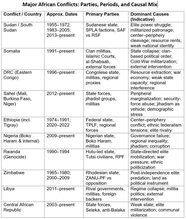 This diversity alone dispels any notion that Africa’s wars arise from a common cause. They do not share a singular origin, but rather interrelated pressures that vary in intensity. The factors that contribute to conflict, as illustrated in the table below, represent the multiple, interacting influences shaping these situations rather than definitive explanations for any single case.