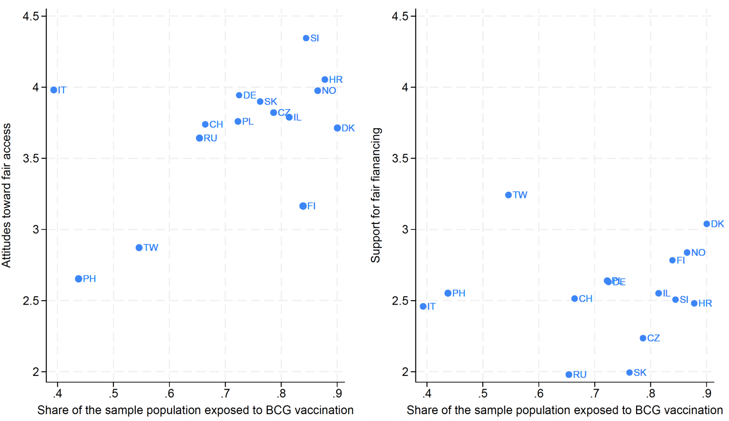 Notes: This figure displays a scatter plot correlating the instrument (exposure to the BCG vaccination) with the two outcomes: attitudes towards fair access (panel 1) and willingness to support fair financing (panel 2) at the national level. The size of the circles denotes the standard deviation for each outcome variable measured in each country. To create this scatter plot, we first computed the average levels of concern for both outcomes in every country and then plotted the mean values along the y-axis against the proportion of the population exposed to BCG vaccination along the x-axis.