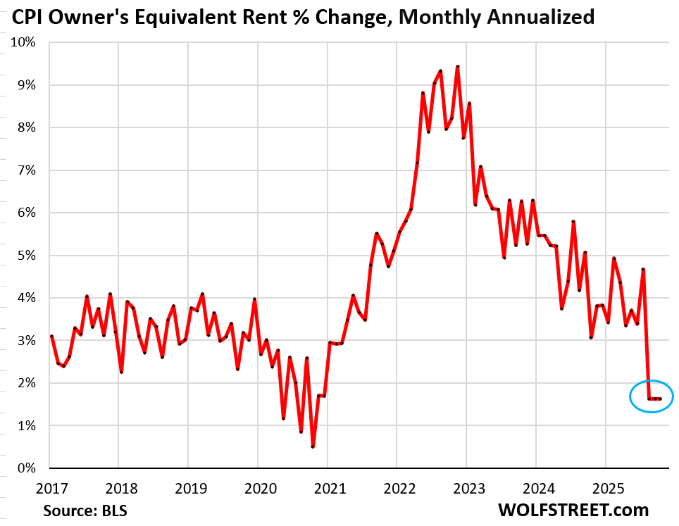 This reveals how clearly manipulated OER looks in terms of month-to-month percentage change, annualized. It has maintained a rate of 1.6% over the past three months, a stark drop from the average of 4.1% recorded in the six months prior to the doctored September numbers. This represents a sudden shift of 2.4 percentage points, persisting for three consecutive months.
