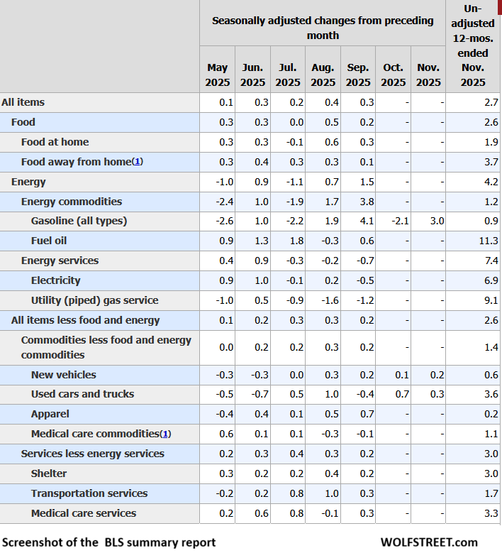 This screenshot of the CPI summary table shows that almost all the month-to-month change entries for October and November are absent, with the sole exceptions being figures derived from “nonsurvey data,” such as gasoline and vehicle prices (the BLS purchases vehicle data from J.D. Power).