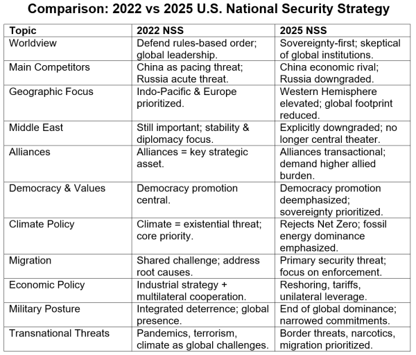 The main narrative of the NSS is less about rhetorical surprises and more about recognizing constraints. The U.S. has struggled to sustain two proxy wars, restock essential munitions, adhere to naval shipbuilding timelines, and recruit sufficient personnel for a peacetime military. These shortcomings, frequently ignored in discussions surrounding the NSS, represent the facts leading to the decline of Full Spectrum Dominance. The comparison chart below highlights the differences between the latest NSS and the 2022 version, offering insights into the monumental shifts in strategy.