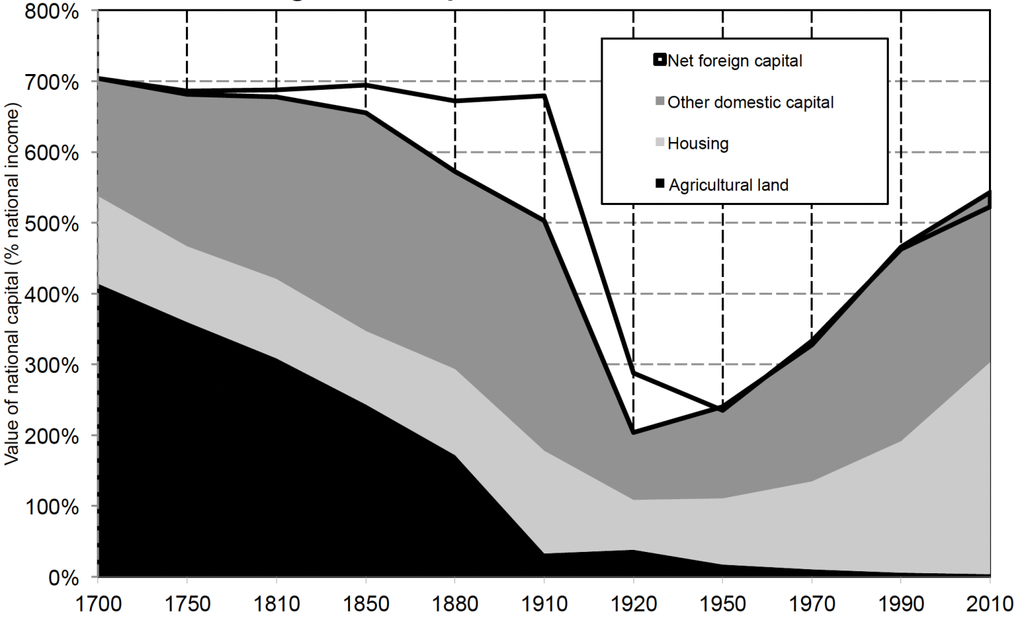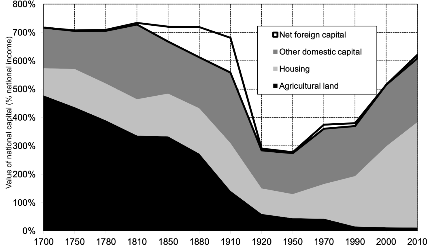 Data from Piketty’s (2014) work Capital in the 21st Century reveals that the increasing share of housing in the total capital stock has been observable since the 1960s and 1970s (refer to Figure 1). This trend poses a complex question. One would typically expect house prices to align with construction costs over time. Although there may be some rise in relative construction costs, it is unlikely that this can fully account for the long-term upward trend.