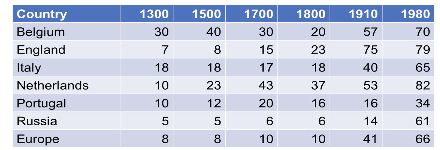 Consistent with Lucas’ analysis, cities have historically been pivotal to economic advancement. Periods of exceptional economic prosperity have correlated with urbanization, whereas downturns have seen a decline in urban growth. This dynamic is effectively illustrated in Table 1, utilizing data compiled by Bairoch (1988). Belgium emerged as the world’s most urbanized nation at the zenith of its textile industry from 1300 to 1500. Subsequently, the Dutch Republic surpassed Belgium, leading to a decline in its urbanization rates. As noted earlier, the Netherlands enjoyed unparalleled prosperity during the subsequent two centuries, becoming the most urbanized country globally, with Amsterdam at the forefront as a major port and financial hub. Although the Netherlands maintained its status as the wealthiest nation well into the 18th century, its preeminence, along with urban growth, gradually diminished until the UK overtook it around 1850, coinciding with its rapid industrialization.