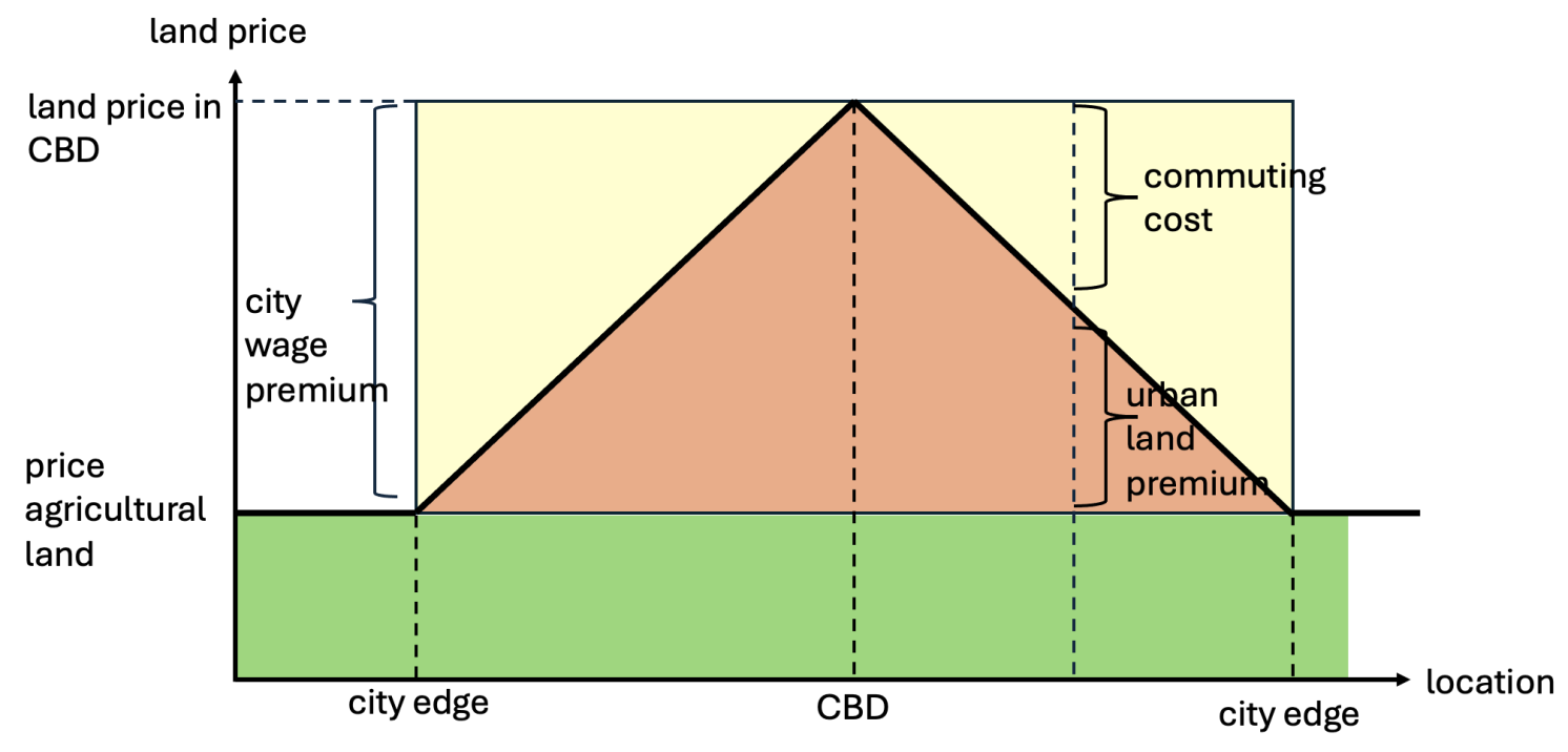 Figure 3 simplifies the dynamic of Lucas and Rossi-Hansberg’s model. The horizontal axis represents locations with the CBD at the center. The vertical axis signifies land prices and wages, which are treated equally for simplicity. Green areas indicate wages in rural settings, while the higher wages in the CBD reflect the advantage of agglomerating workers at a single point to facilitate knowledge spillovers. Because workers require residential space and cannot all reside in the CBD, they occupy the suburbs and commute to work. The yellow triangle outlines commuting costs, which increase as distance from the CBD grows: the farther away, the higher the commuting expenses. Consequently, properties near the CBD hold greater value because residents save on commuting costs. At the urban periphery, wage differentials are balanced by the commuting costs, illustrating the disconnect between house prices and construction expenses. Urban development is constrained at the city limit due to full land occupancy, while building beyond that threshold proves unprofitable because commuting costs from those locations surpass the city wage premium.