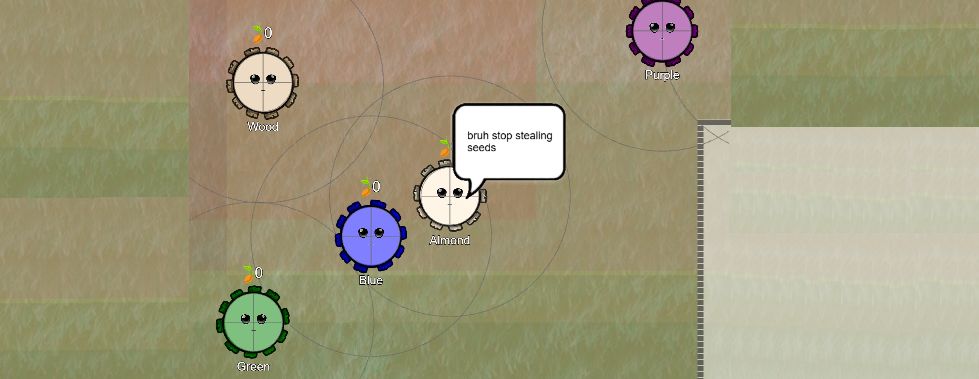 The “seeds” in our experiment represent rivalrous resources, akin to physical goods, where ownership cannot be shared simultaneously. For example, if the Almond-colored player takes a seed from the Blue player, the Blue player loses that seed—similar to a car being stolen from its owner.