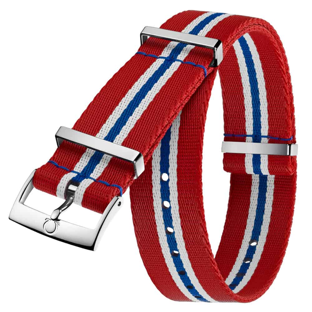 - Omega NATO Strap Polyamide 5‑stripe Red, White and Blue Strap