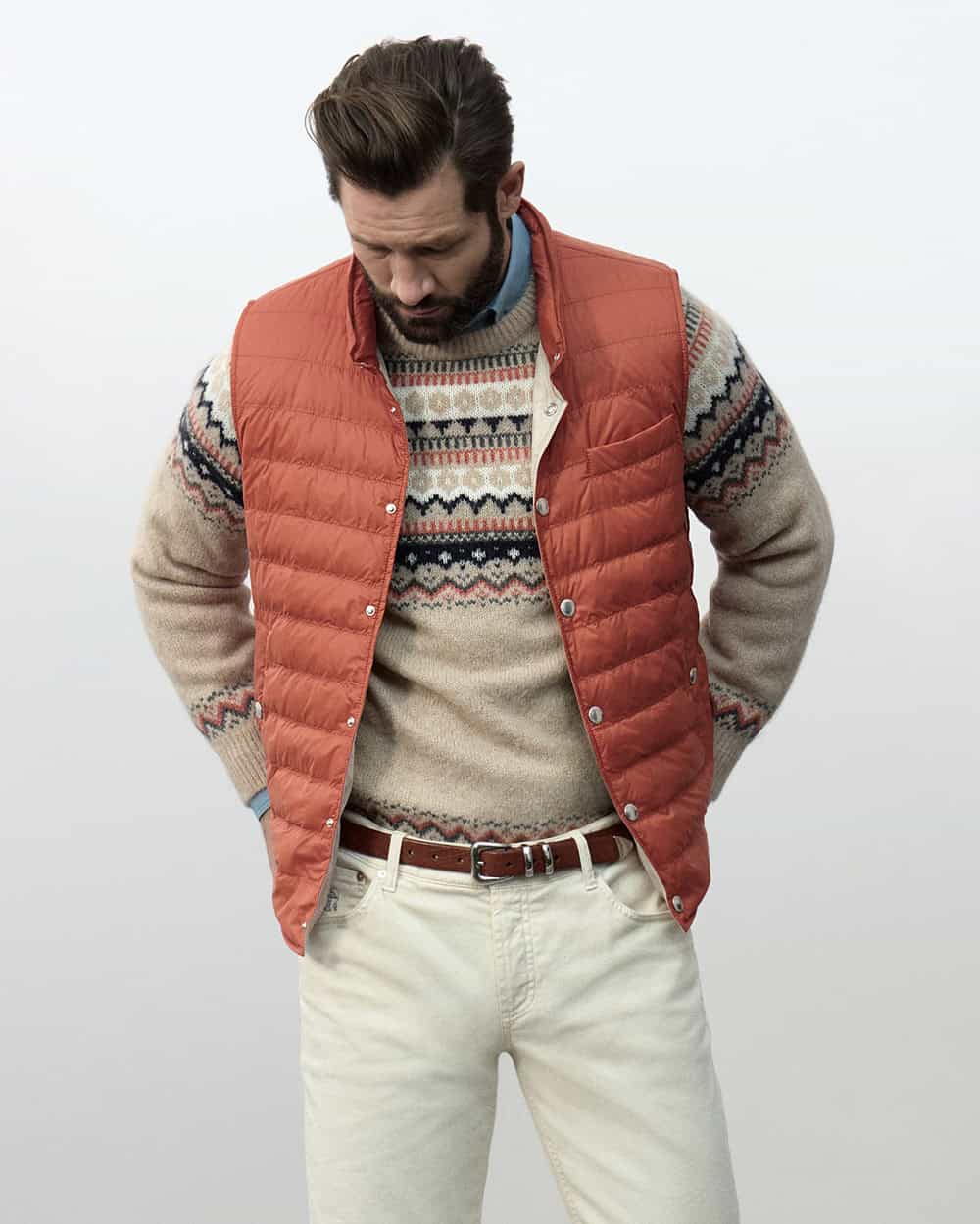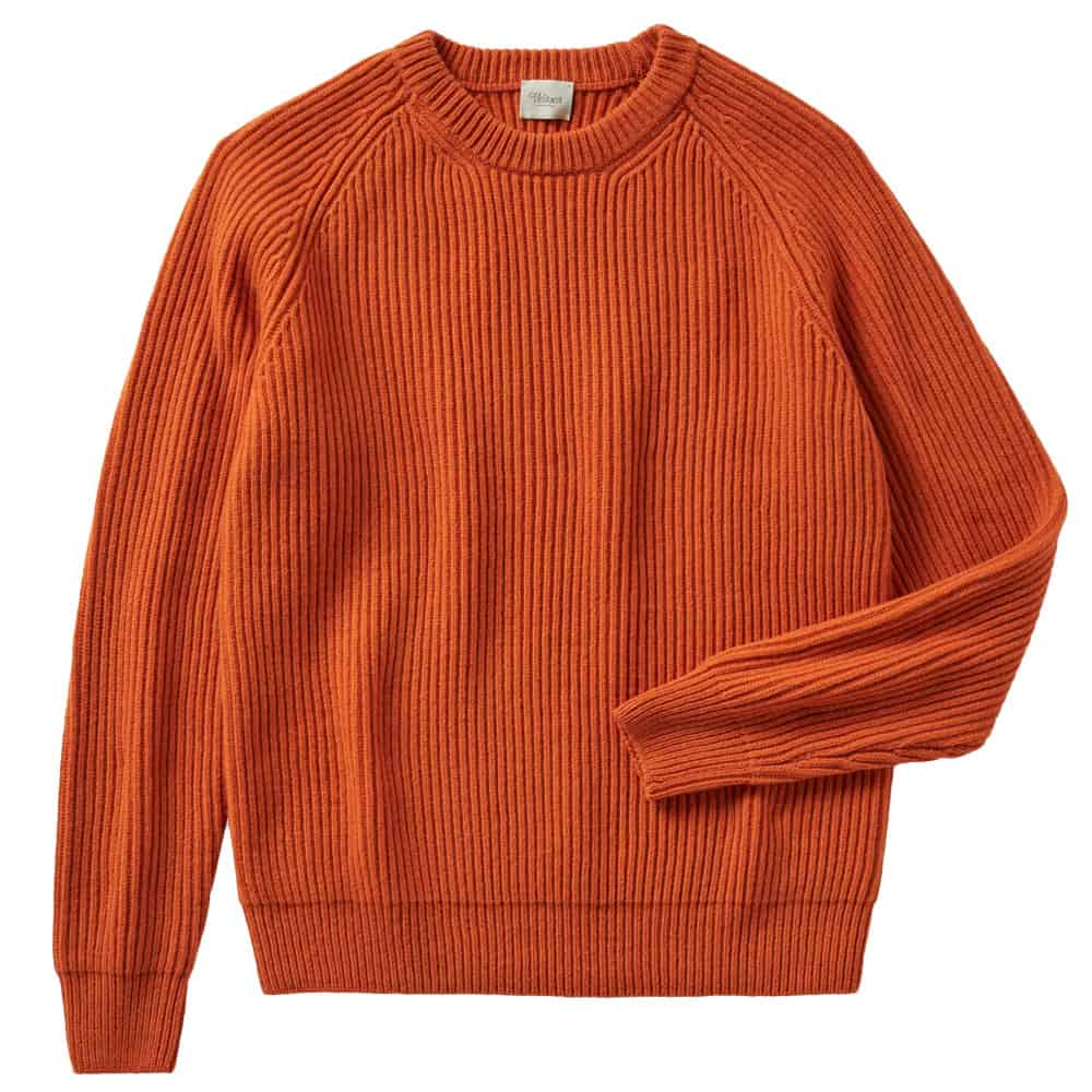 Thanks to its heavy texture, knitwear holds dye extremely well, which means colours look nice and rich. One time-honoured way to incorporate some colour is to wear a knitted crew neck as a mid-layer, opting for a bold block colour like royal blue or burnt orange.