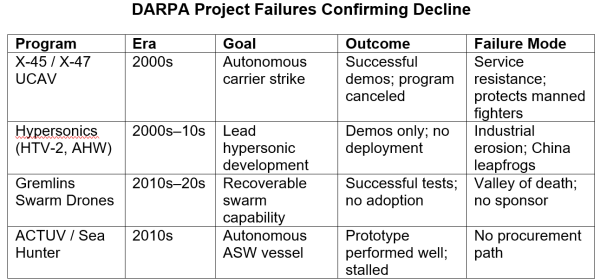 This article explores the transformation of the Defense Advanced Research Projects Agency (DARPA) from an innovative powerhouse in American technology to an agency hampered by political caution, industrial decline, and bureaucratic inertia. By highlighting its peak years marked by revolutionary developments such as ARPANET, stealth technology, GPS, and computer advancements, we investigate the changes that have led to DARPA producing fewer groundbreaking capabilities. Our analysis identifies three principal shortcomings: political interference, risk aversion in industry, and a system of incentives that discourages program completion.
