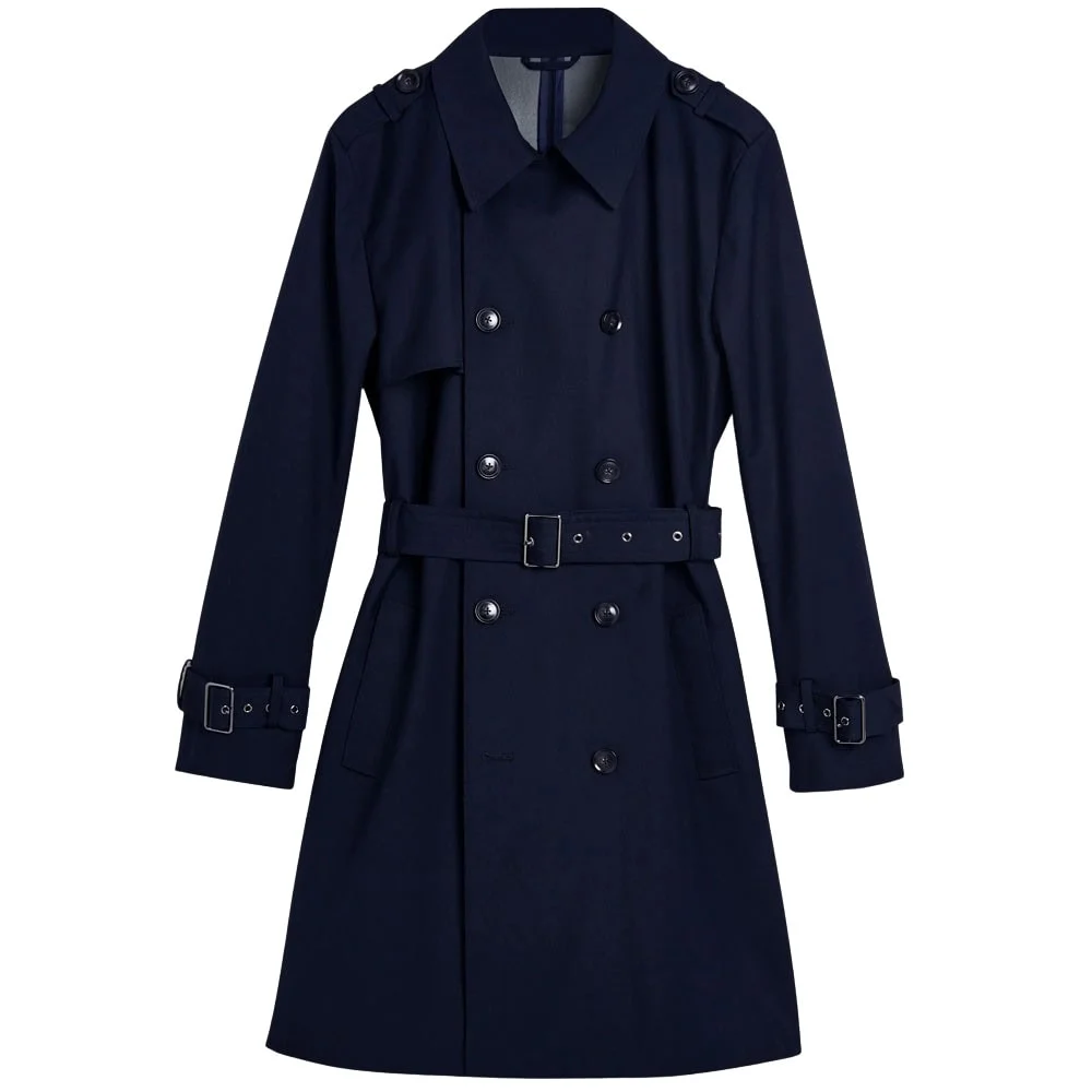 Traditionally the trench coat featured a double-breasted cut, but single-breasted is a legitimate modern-day option. A double-breasted design will likely boast up to 10 front buttons, wide lapels, a storm flap and button-close pockets. But no matter which cut you opt for, ensure that it comes with adjustable sleeves and a belted waist for a secure, form-flattering fit.