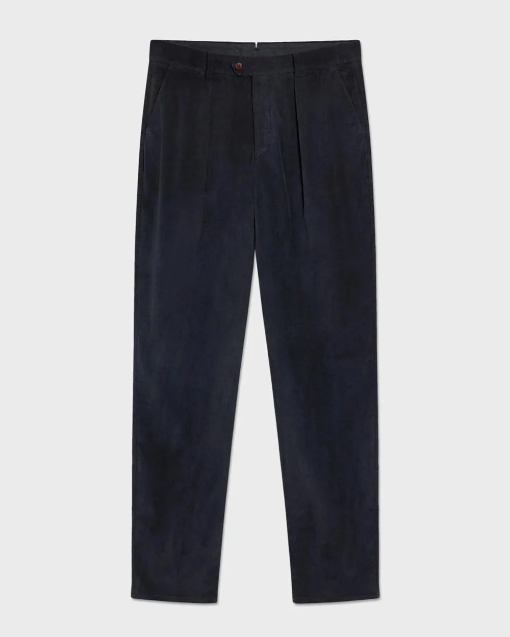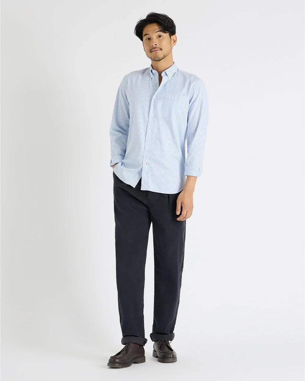 This outfit illustrates how corduroy can easily transition into a smarter look while remaining entirely relaxed. A pale blue Oxford shirt adds an immediate touch of polish, while the dark navy trousers enhance the overall sophistication — a combination that feels modern, fresh, and subtly confident.