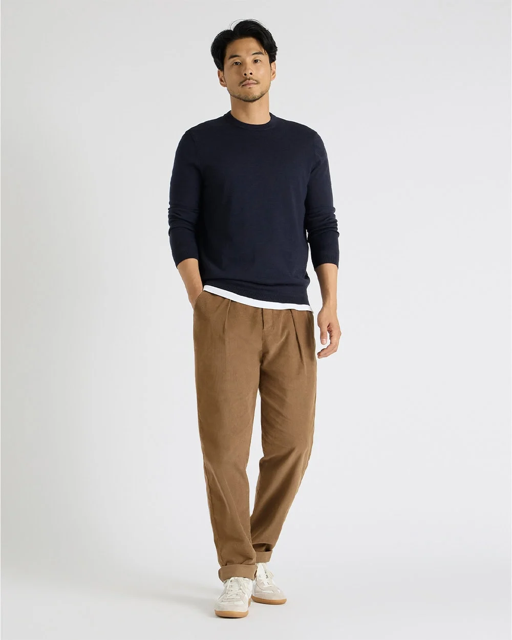 This is corduroy at its most laid-back. A navy crew neck paired with a clean white tee peeking out underneath, complemented by SPOKE’s Cord Hackneys in a warm, mid-brown shade — this outfit perfectly embodies effortless weekend style without overthinking it.
