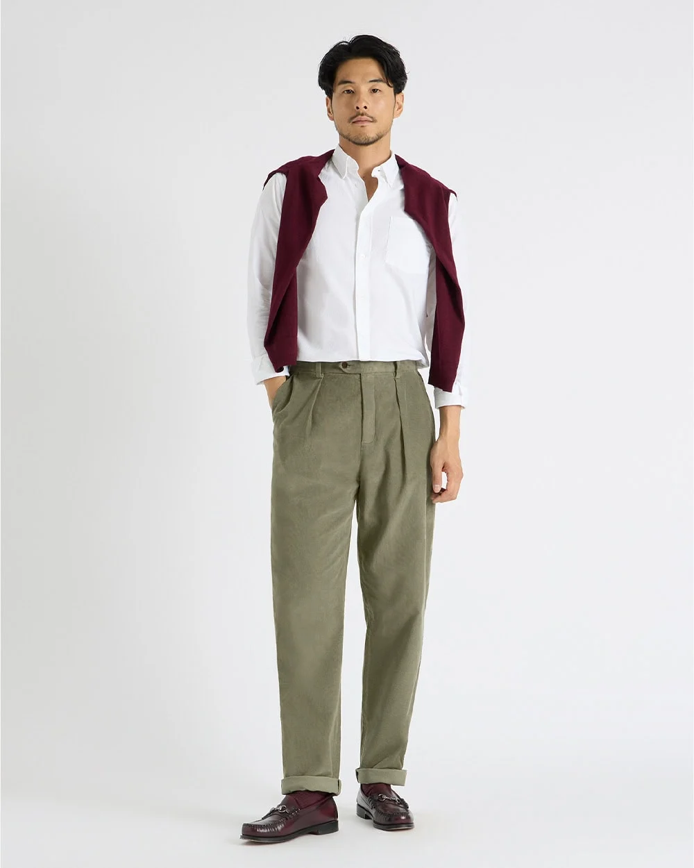 The pleated, high-rise trousers bring tailored sharpness that chinos simply can’t provide, while their earthy tone allows for easy combinations with rich knits and polished leather loafers. Rolled hems maintain a relaxed feel, preventing the outfit from becoming overly formal.