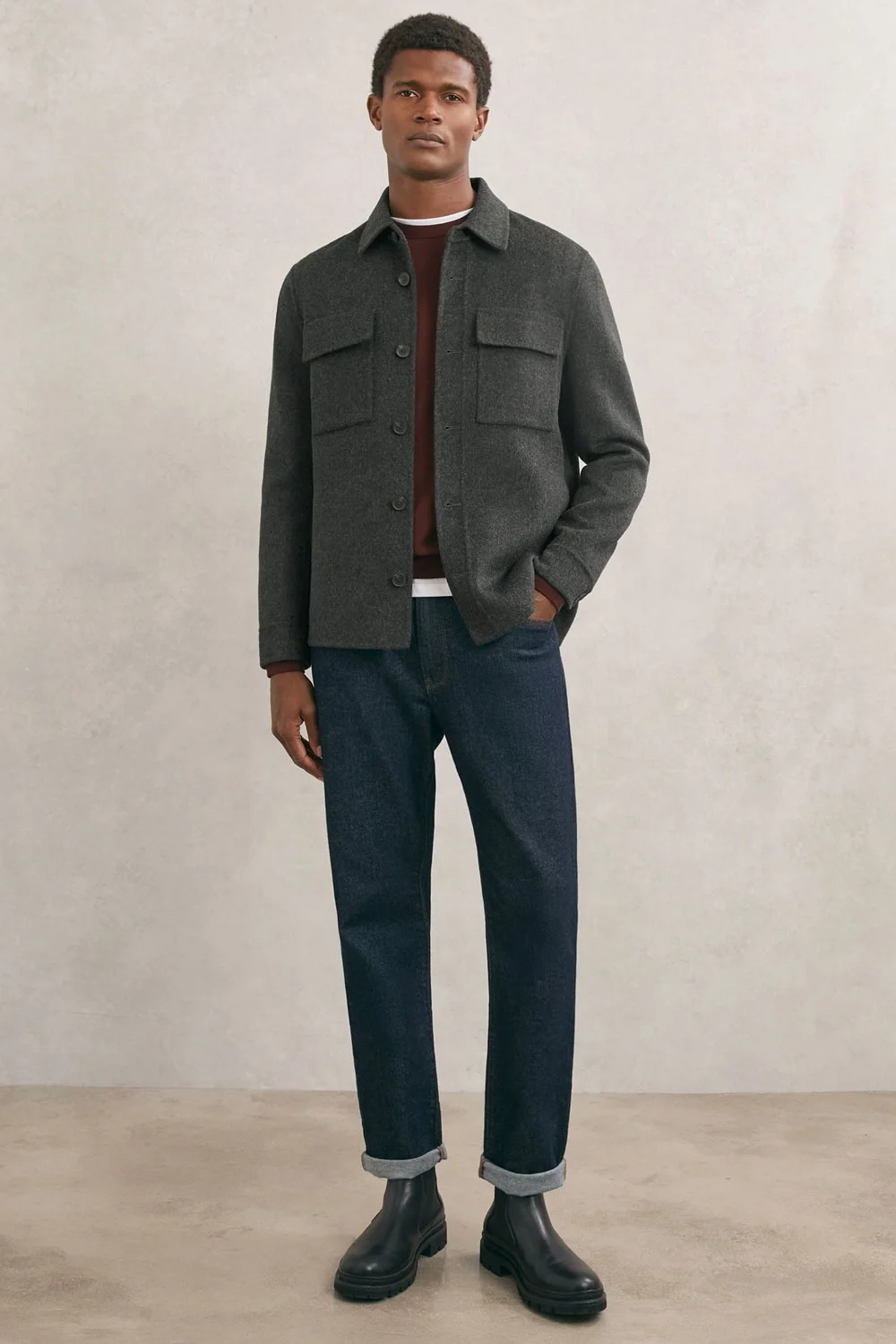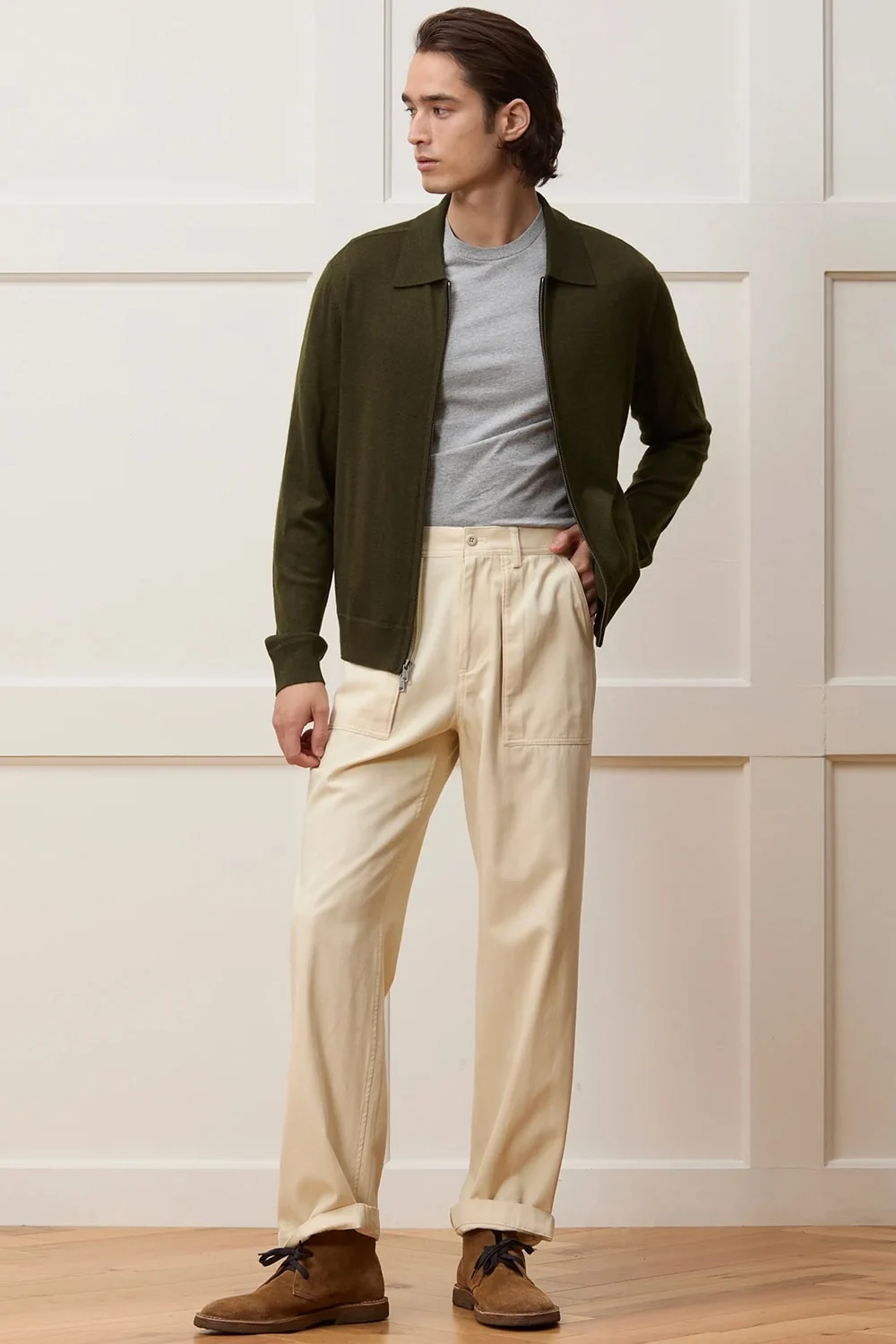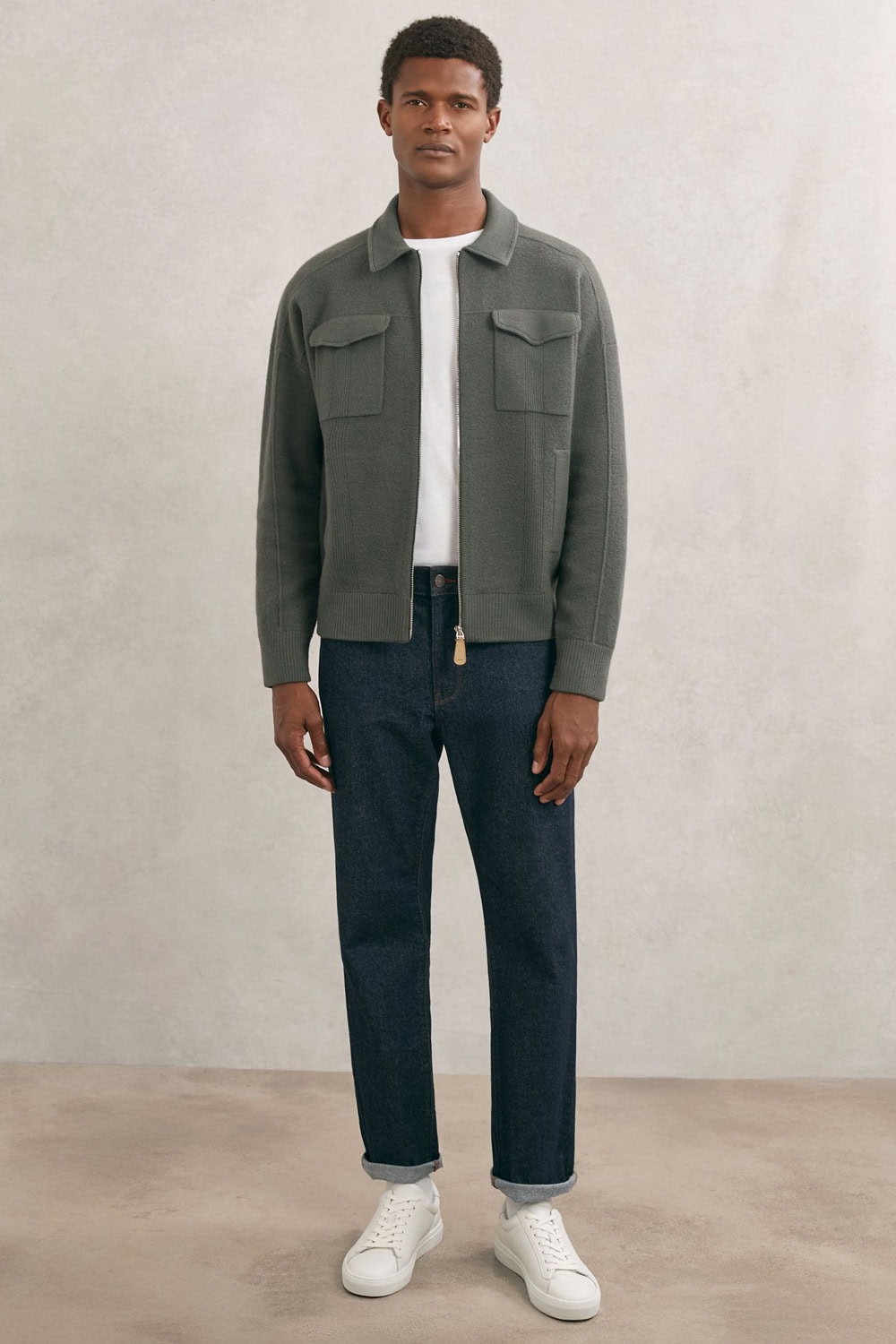 If you’re leaning toward jeans, switch the colors for your upper body—choose an olive bomber or overshirt complemented by a beige knitted sweater.