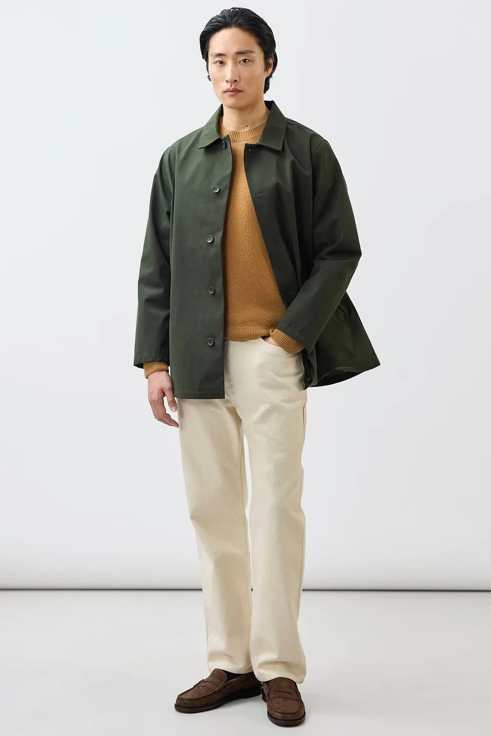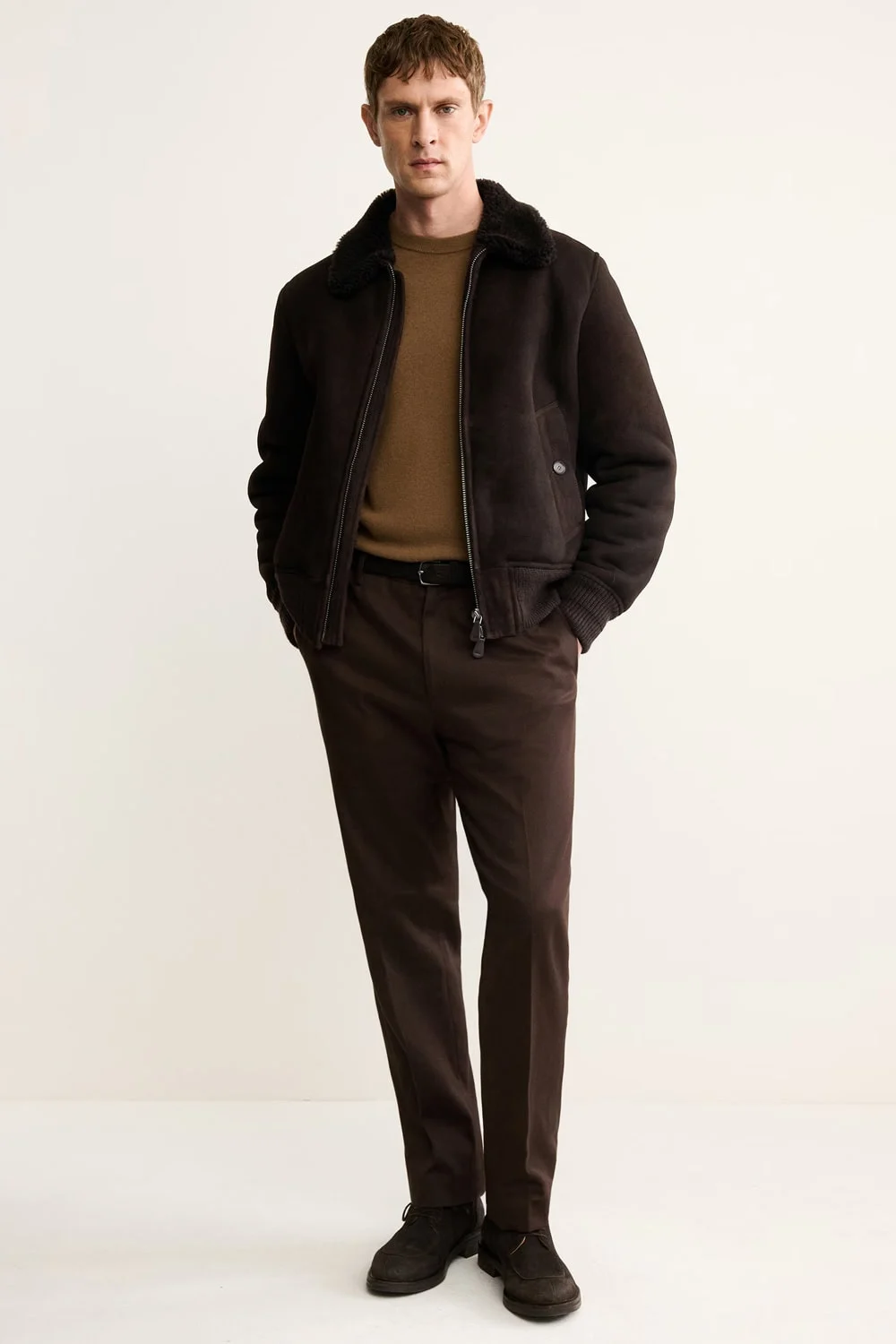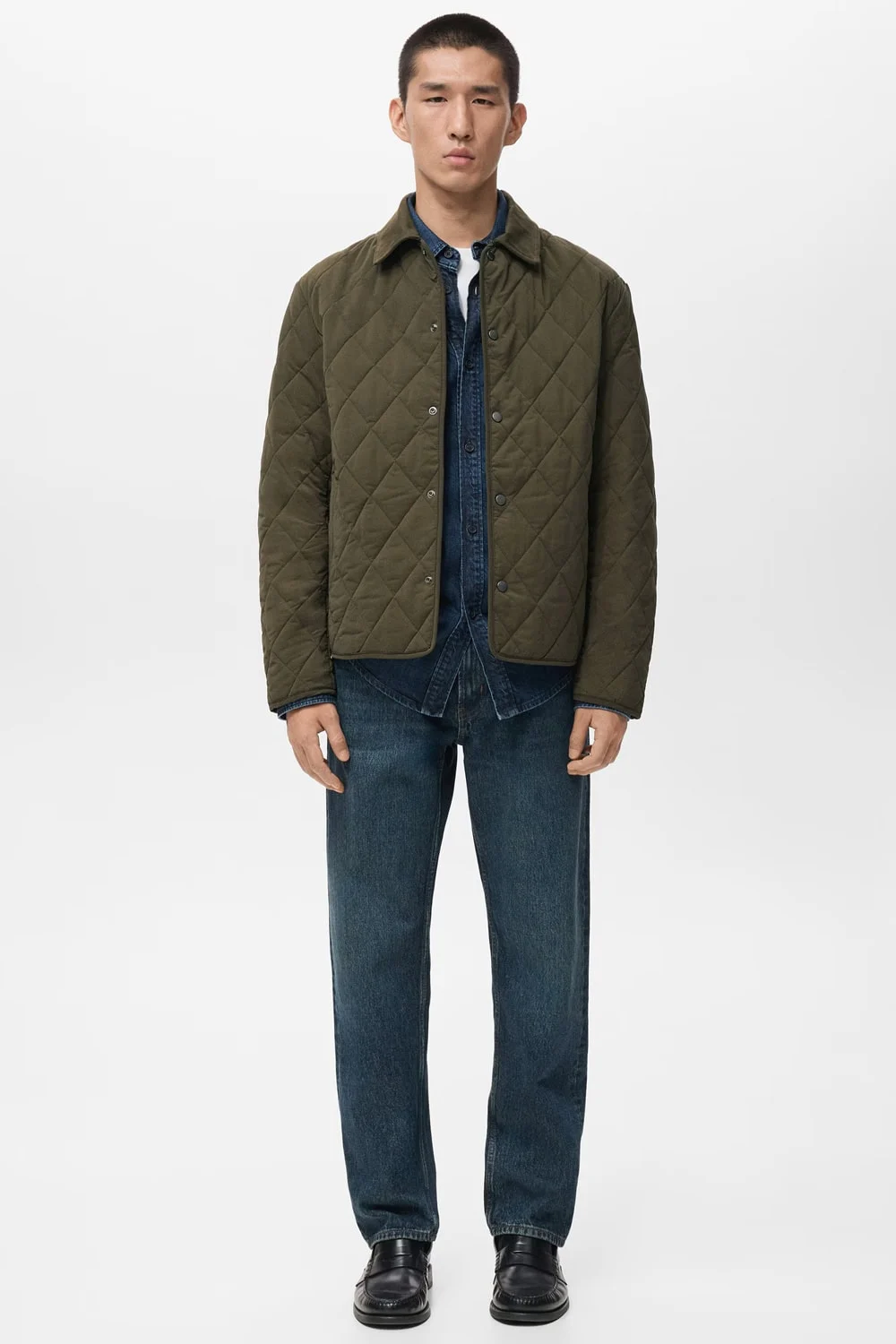If you’re leaning toward jeans, switch the colors for your upper body—choose an olive bomber or overshirt complemented by a beige knitted sweater.