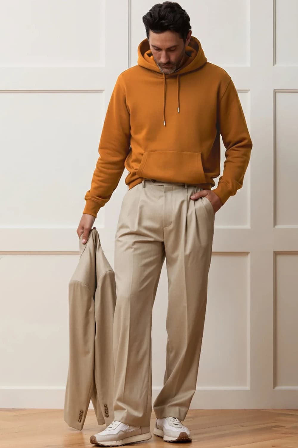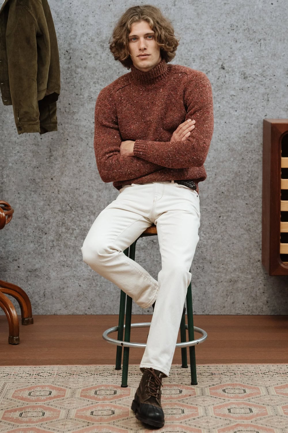 Instead of opting for burnt-orange trousers, try incorporating this rich hue into your outerwear. A puffer, parka, or wool overshirt in burnt orange is an excellent choice, and knitted garments look great, too. For the bottom half, ecru denim creates a fresh contrast against the vibrant top.