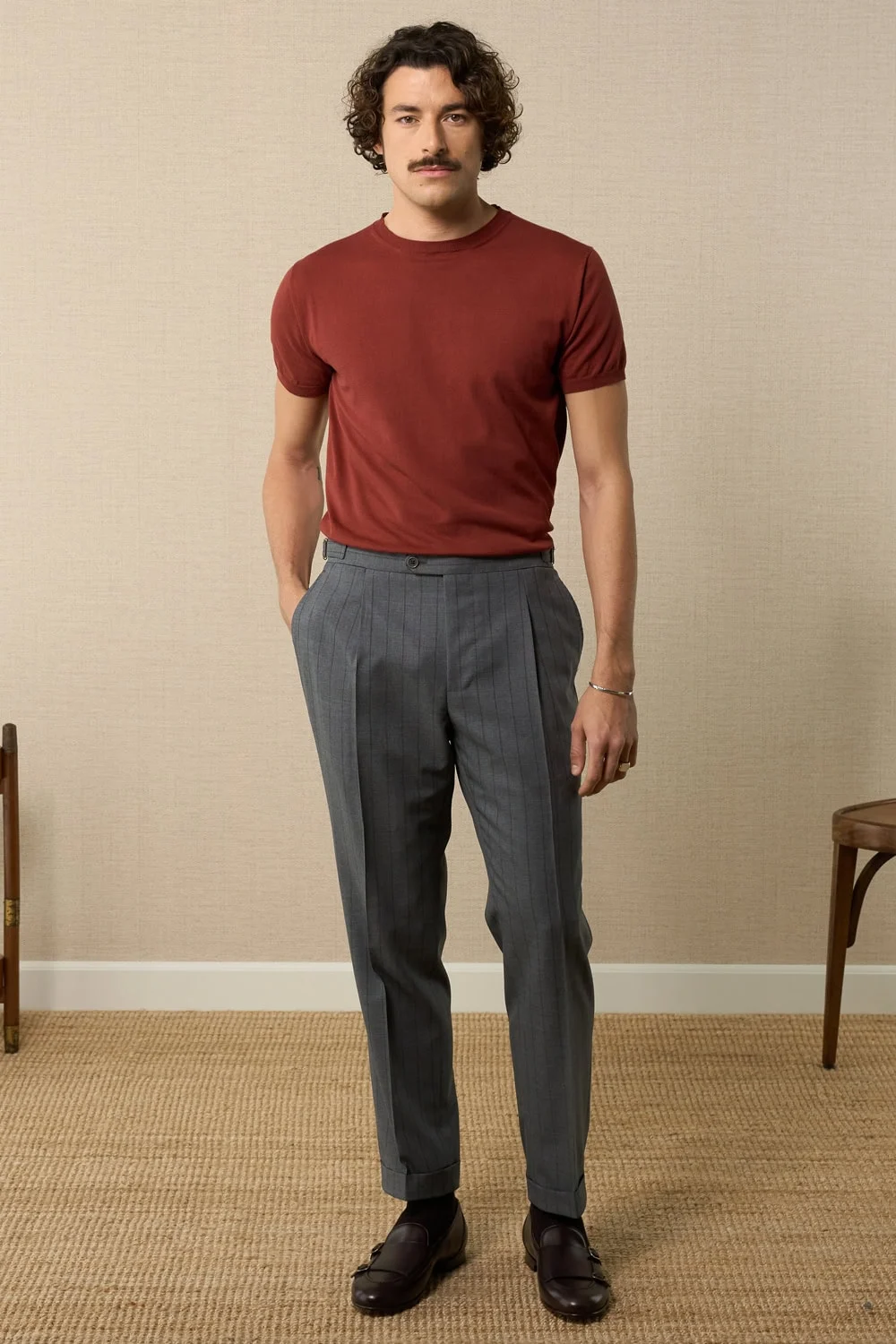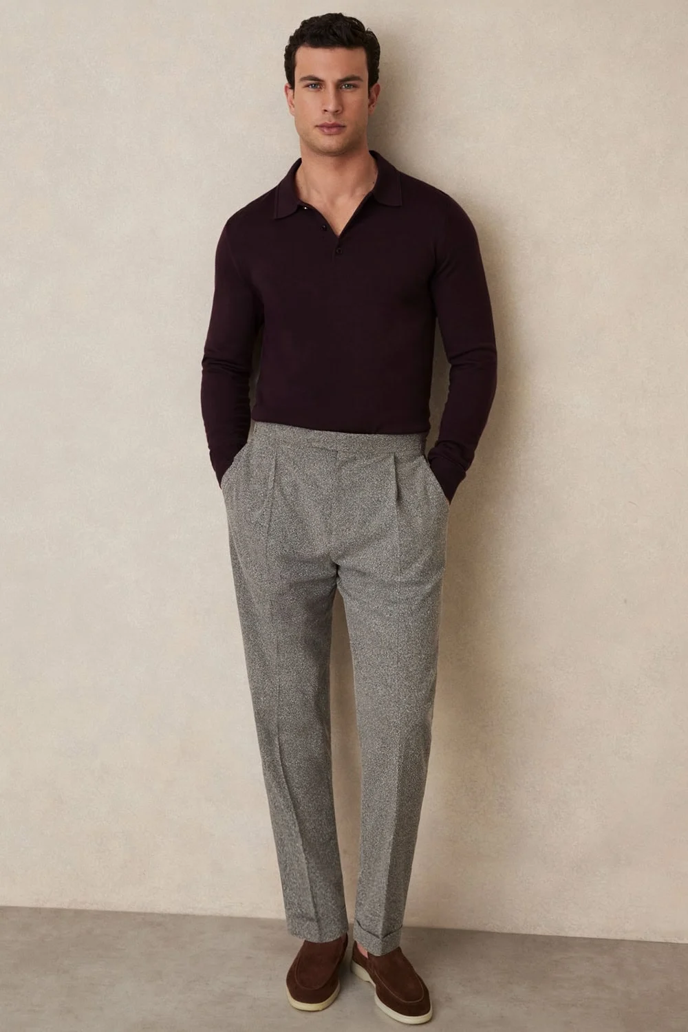 In tailored outfits, consider a grey suit as a base and add maroon through knitwear. A classic crew-neck sweater in this rich, dark hue adds warmth without excess bulk, making it an ideal choice.