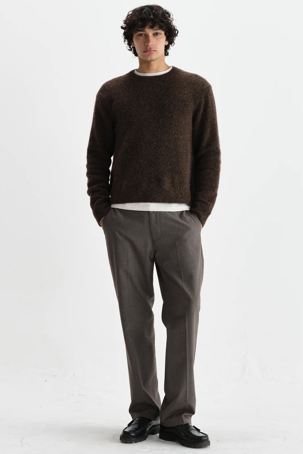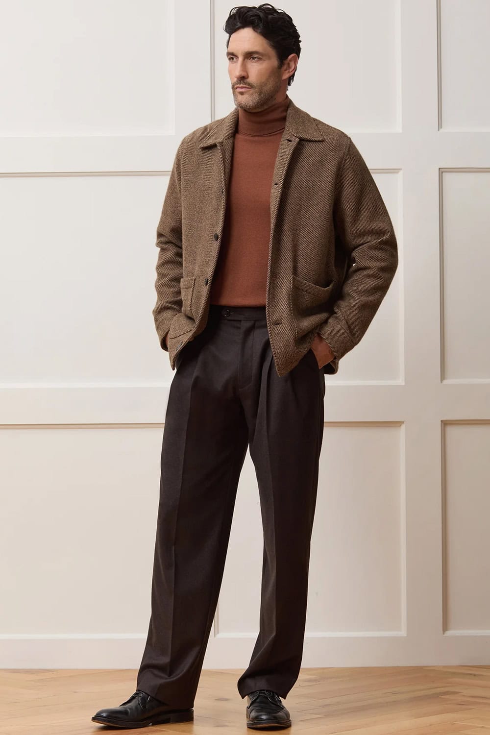 A simple method is to anchor your look with dark brown pants, then layer on lighter tones—think tobacco-colored knitwear topped with a camel overcoat. Alternatively, reverse the order with lighter bottoms, a medium brown sweater, and a darker outer piece.