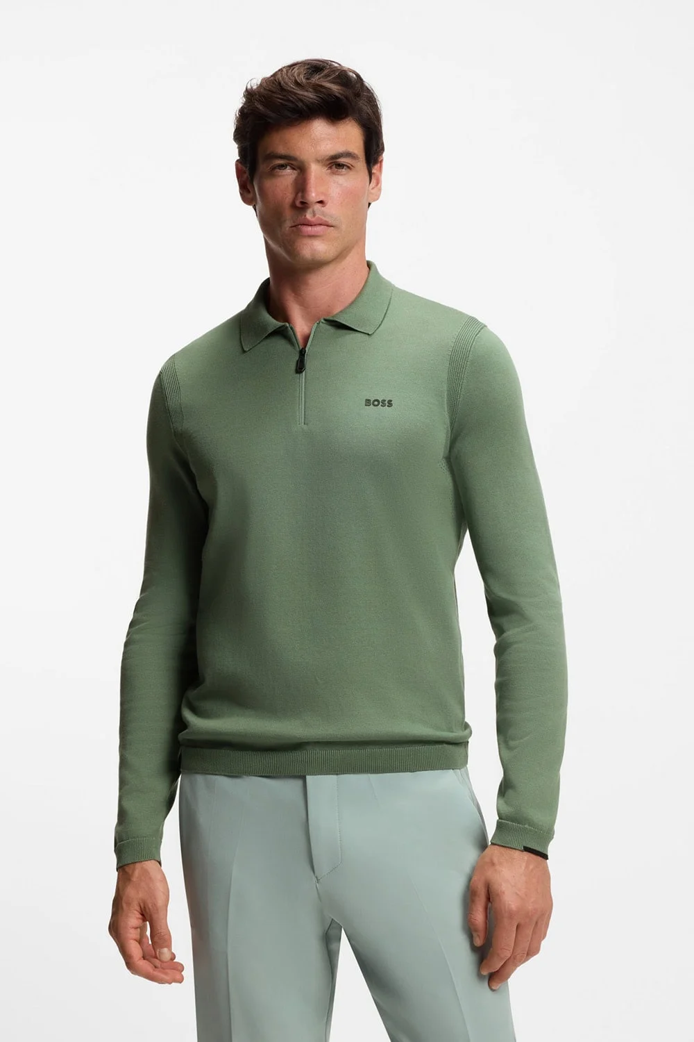 A sophisticated knit featuring a slightly vintage vibe. This regular-fit cotton sweater is equipped with a sleek polo collar, adding a refined touch that elevates the overall look without veering into formal territory.