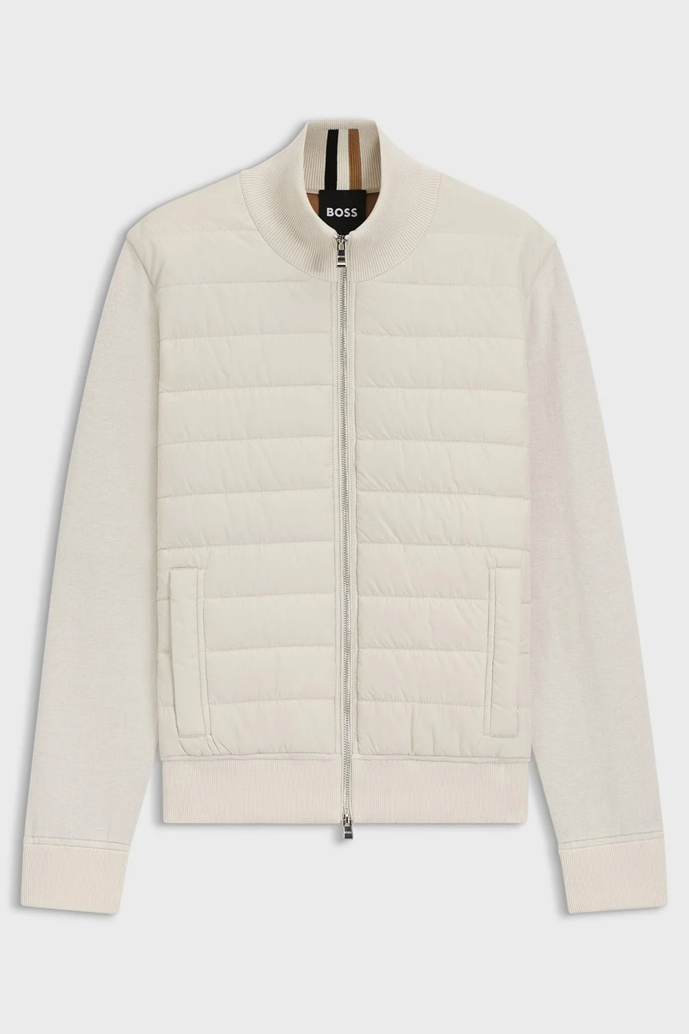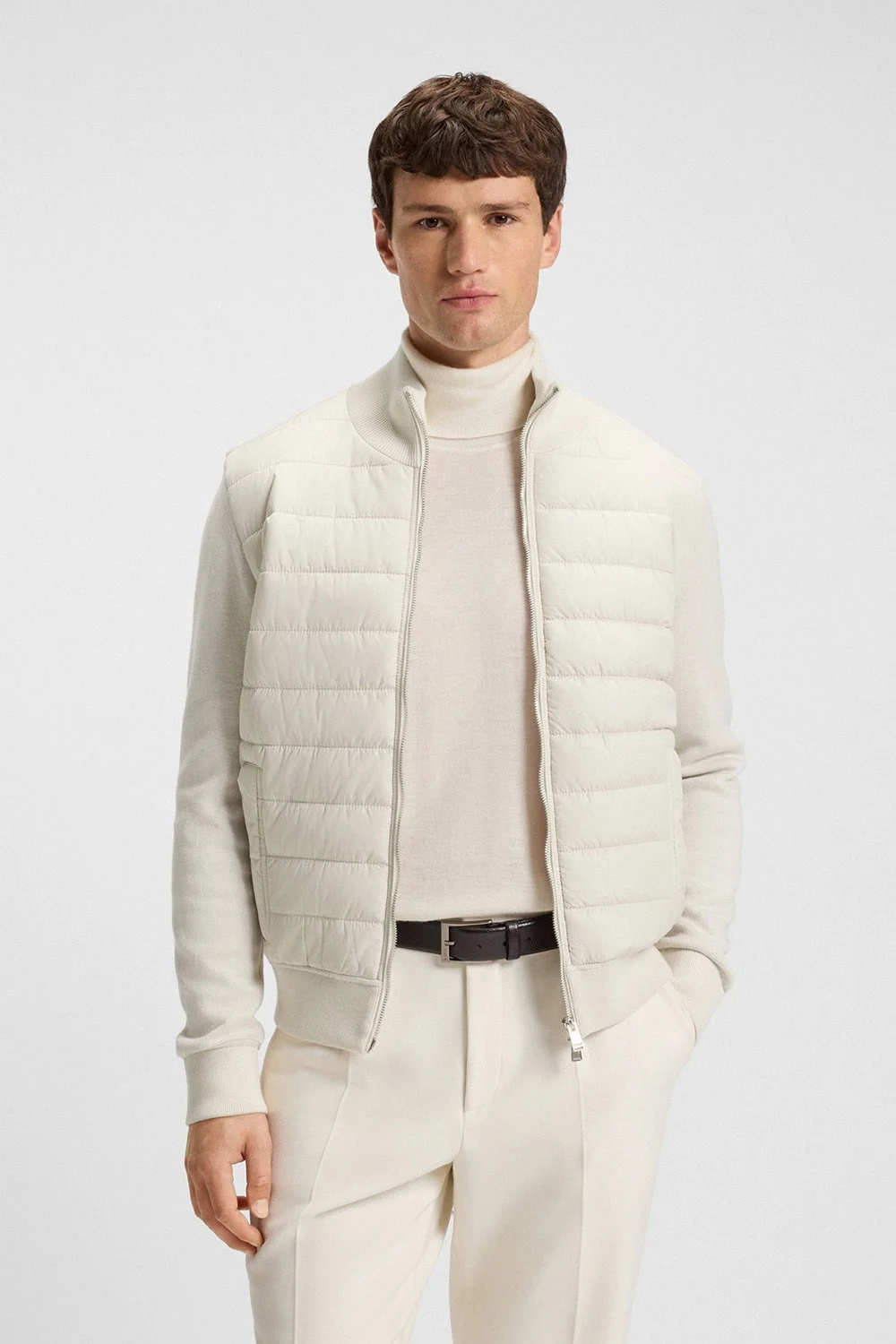 A contemporary essential designed for chillier weather. This mixed-material jacket combines a sleek knitted back and sleeves with a lightly padded front, ensuring warmth where you need it while maintaining sharp lines everywhere else.