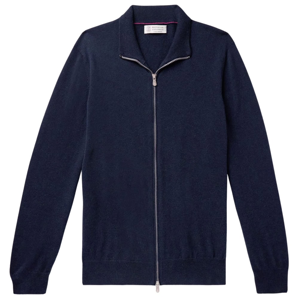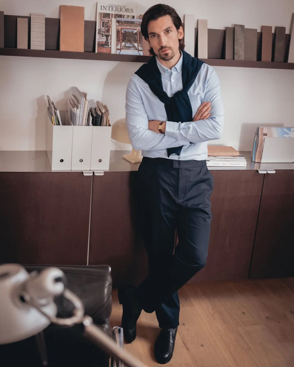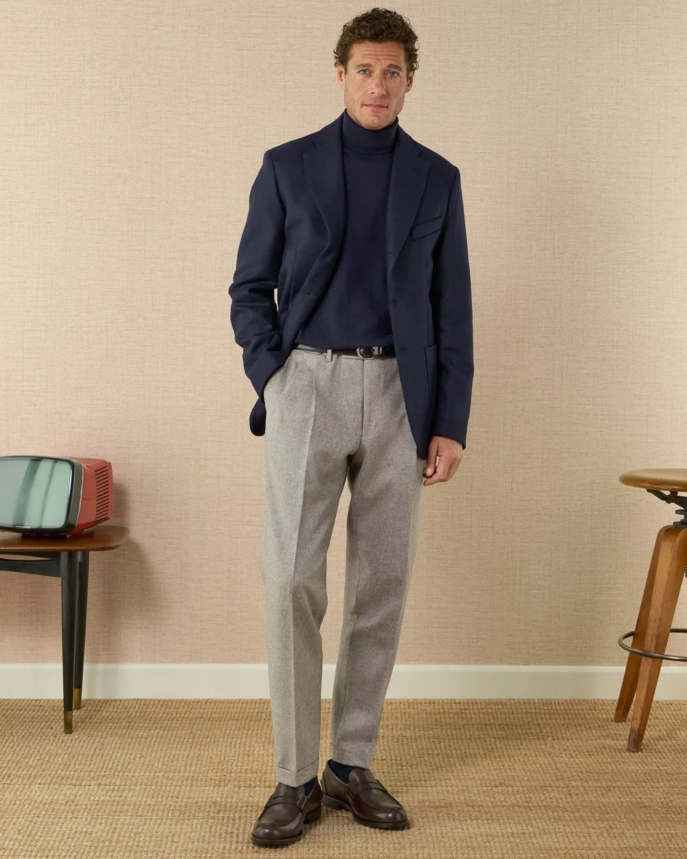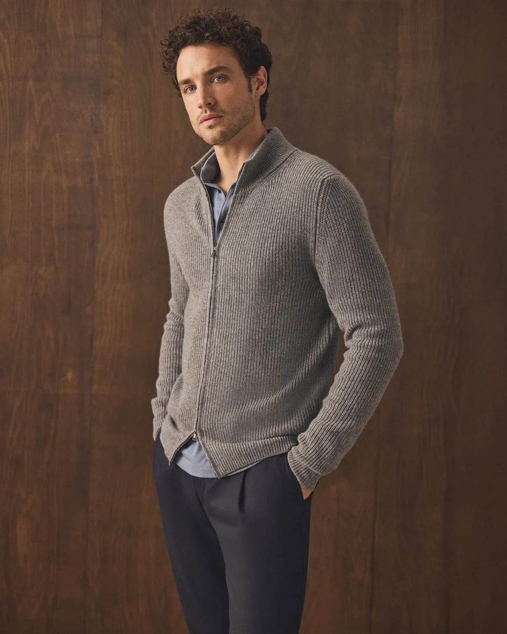 A cashmere crewneck or zip-up cardigan can be a great alternative to a blazer for smart-casual occasions. Wear it with a slim-fit T-shirt tucked neatly into the waistband of some tailored wool pants and top it off with some chunky Derbies and a wool overcoat.