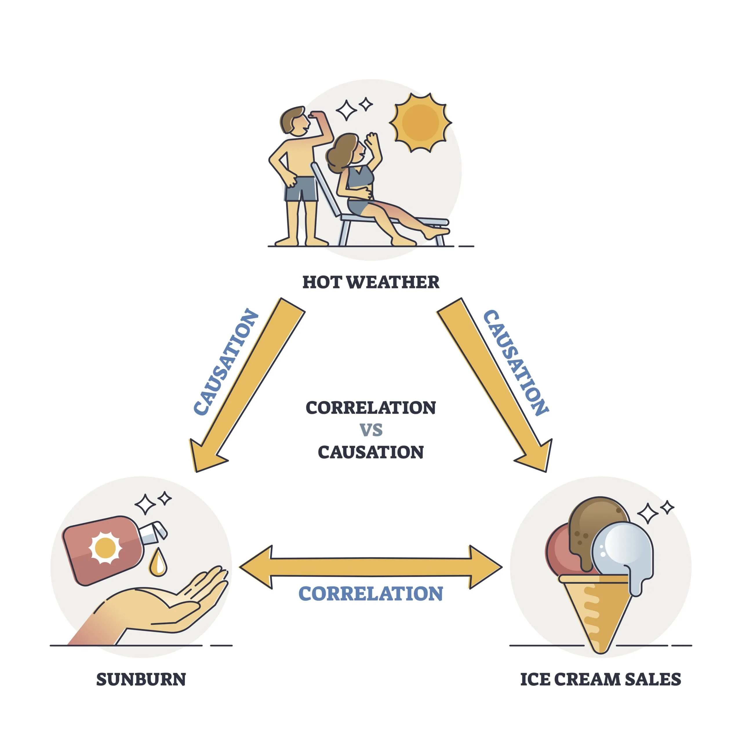 Did you know that indulging in ice cream can increase your perceived risk of sunburn? While this notion is purely fictional, it’s an interesting observation. If you were to plot a graph illustrating the trends of ice cream consumption against sunburn cases over time, you’d notice a striking similarity between the two. This illustrates a correlation—a situation where two or more variables change in tandem without necessarily affecting one another. In contrast, causation indicates a direct relationship where one variable’s change directly impacts another.