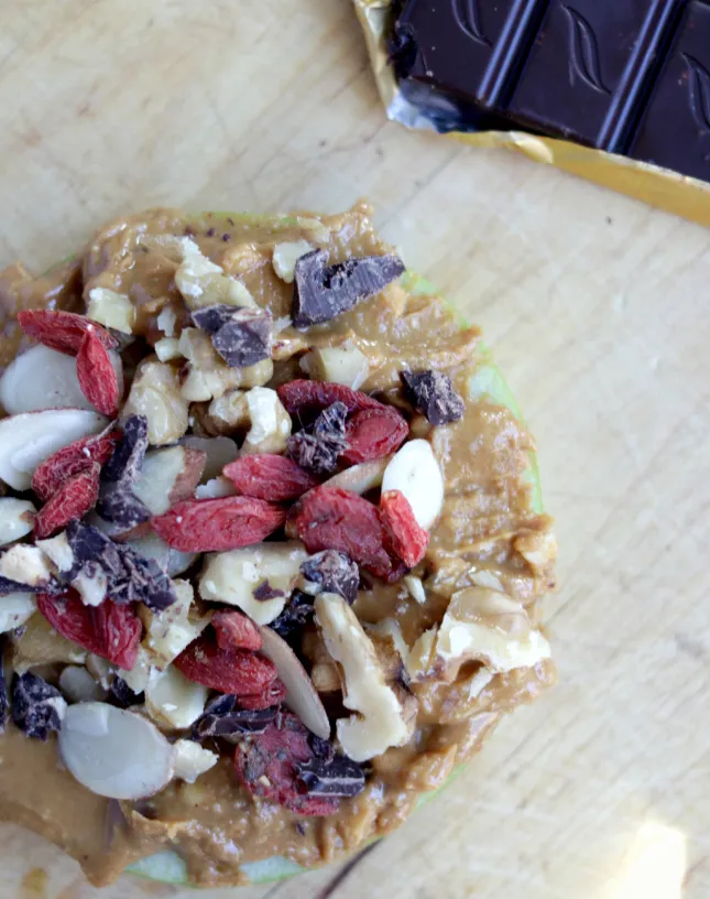 This delightful snack combines the crispness of a Granny Smith apple with the crunch of nuts, the creaminess of peanut butter, a hint of bitterness from the dark chocolate, and a touch of sweetness from the goji berries, which are rich in antioxidants. It’s a far better alternative to a candy bar! Plus, it takes just a few minutes to prepare and is absolutely delicious, making it a guilt-free treat.