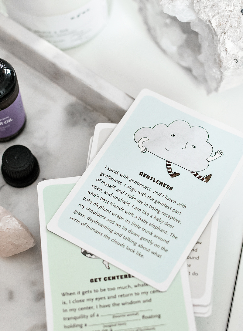 You might also include cherished photographs, uplifting affirmations, quotes, or trinkets in your kit—anything that evokes happy memories or feelings. For me, scents of lavender and peppermint are particularly soothing, so I often diffuse these essential oils when reading or enjoying a bath. Instead of tangible items, you might also write simple reminders for yourself, such as: go for a run, meditate, call a friend, take a long bath, etc.