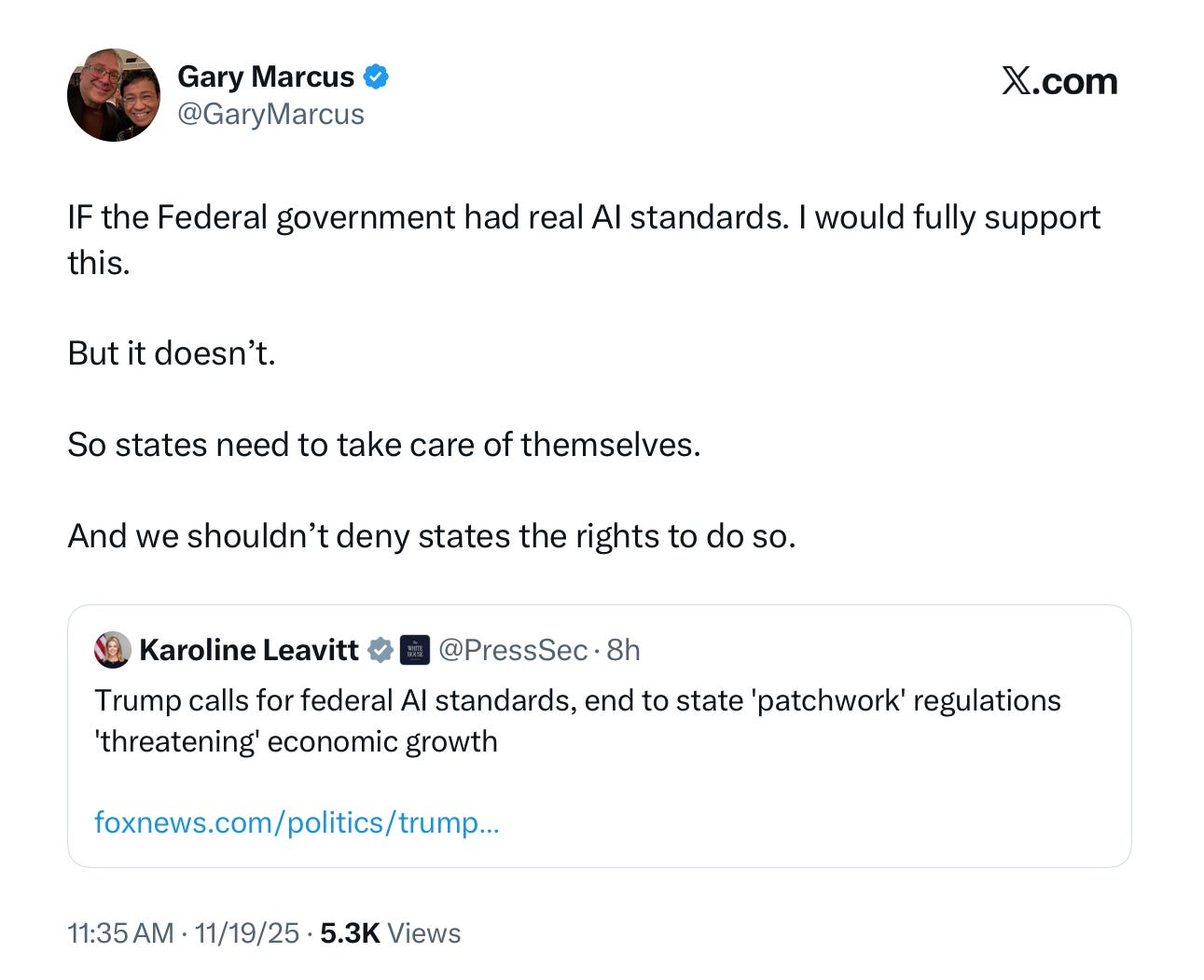 As I mentioned earlier on X, advocating for federal AI standards instead of state regulations would make sense only if Congress introduces sound federal standards. However, no significant proposals have been put forward for a vote.