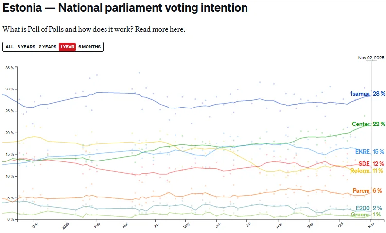 Estonia’s government was elected in 2023, with the Reform Party, led by Kaja Kallas, winning 31.2% of the vote; EKRE coming in second with 16.1% and the Centre Party third with 15.3%. https://www.politico.eu/europe-poll-of-polls/estonia/ Since the elections, support for the coalition government comprising Reform, the Social Democratic Party, and Eesti 200 has plummeted. https://news.err.ee/1609848678/norstat-poll-reform-party-rating-hits-new-low-point In response to declining domestic approval, Kallas resigned mid-2024 to take up the role of EU’s foreign minister.