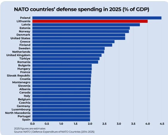 This increase was formally enacted last April, following the approval of a €2.8 billion augmented defense funding bill over four years to meet NATO requirements as set by former President Donald Trump. This move elevates Estonia from the 19th position globally in terms of defense/GDP ratio, positioning it closely behind Poland and just one rank below the US, aiming to lead among NATO member states.