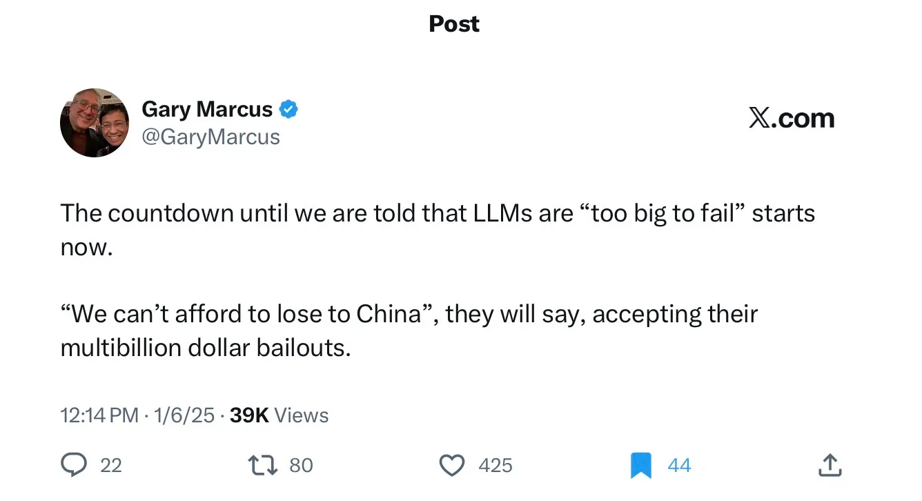 Greetings, it’s Yves. While I typically refrain from sharing entire posts from other authors, I feel compelled to highlight the urgent message from esteemed AI expert Gary Marcus. He has raised significant concerns about the future of AI companies, which appear increasingly unlikely to generate sufficient returns on their substantial investments. This grim reality may lead them to seek a taxpayer-funded bailout under the guise of being “too big to fail.”