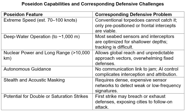 The technical and logistical challenges to defending against Poseidon stem from several factors. Its advanced nuclear propulsion system endows it with exceptional speed, range, and payload capabilities. Additionally, Poseidon takes advantage of the inherent stealth of submarines, designed for optimal acoustic stealth. With its extensive range, a single Poseidon drone can target multiple distant coastal areas, necessitating comprehensive sensor networks and response teams across entire littoral zones, choke points, and seabed corridors. Defending against such a threat incurs a higher cost than that of the Poseidon attacks themselves.