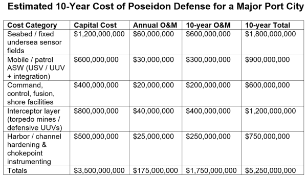 With no existing defenses against Poseidon, the United States will need to develop an entirely new undersea detection and interception architecture. A comprehensive defense package for a single major port—including seabed sensor fields, mobile anti-submarine warfare systems, a dedicated command-and-control operation, and an intercept layer such as torpedo mines or defensive unmanned underwater vehicles—could cost approximately $5 billion per city over a decade, factoring in maintenance and operation costs. Extending this approach to cover around two dozen economically significant U.S. coastal cities could push the total costs into the $100-140 billion range, not including national research and development or program management expenses. Effectively, Russia can impose an enormous defense burden on the U.S. with just a limited array of advanced undersea weapons.