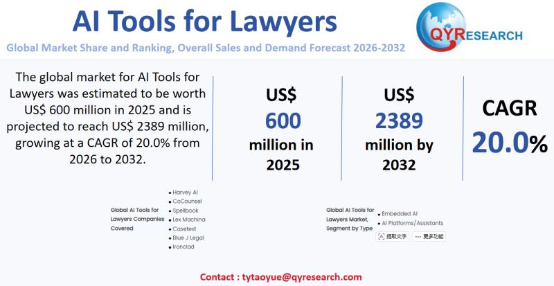 The global AI Tools for Lawyers market was estimated at approximately US$ 600 million in 2025 and is anticipated to expand significantly, with projections reaching US$ 2,389 million by 2032, reflecting a compound annual growth rate (CAGR) of 20.0% from 2026 to 2032.