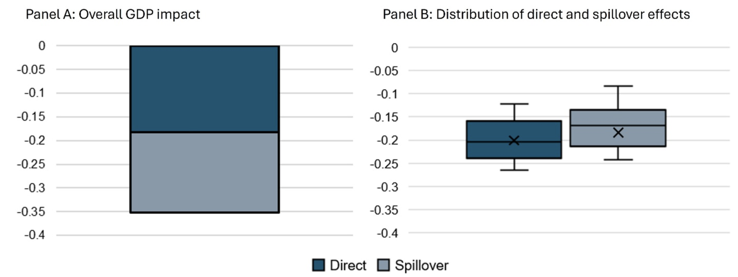 When combining both direct and spillover effects and aggregating across OECD nations, severe disasters within our dataset resulted in an over 0.3% average yearly reduction in GDP, with spillovers accounting for about half of the total loss (Figure 2).