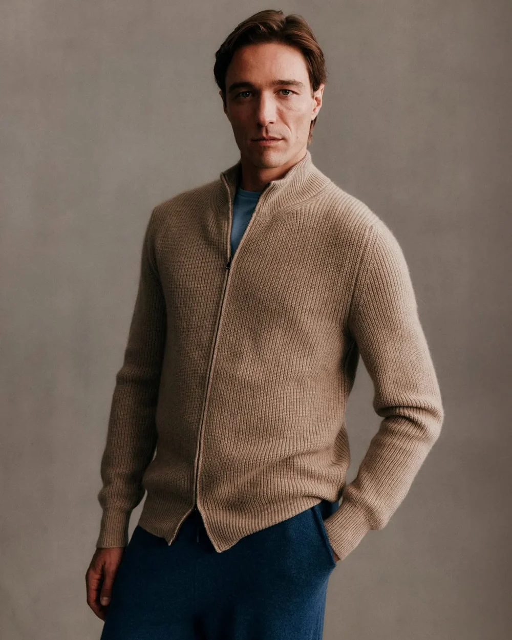 A cashmere zip-through top is an excellent alternative to a cardigan for those who want the functionality and versatility but prefer a slightly more modern look. There are lots of variations out there, but a cashmere bomber is always a good option, as it allows for easy layering and pairs well with just about anything.