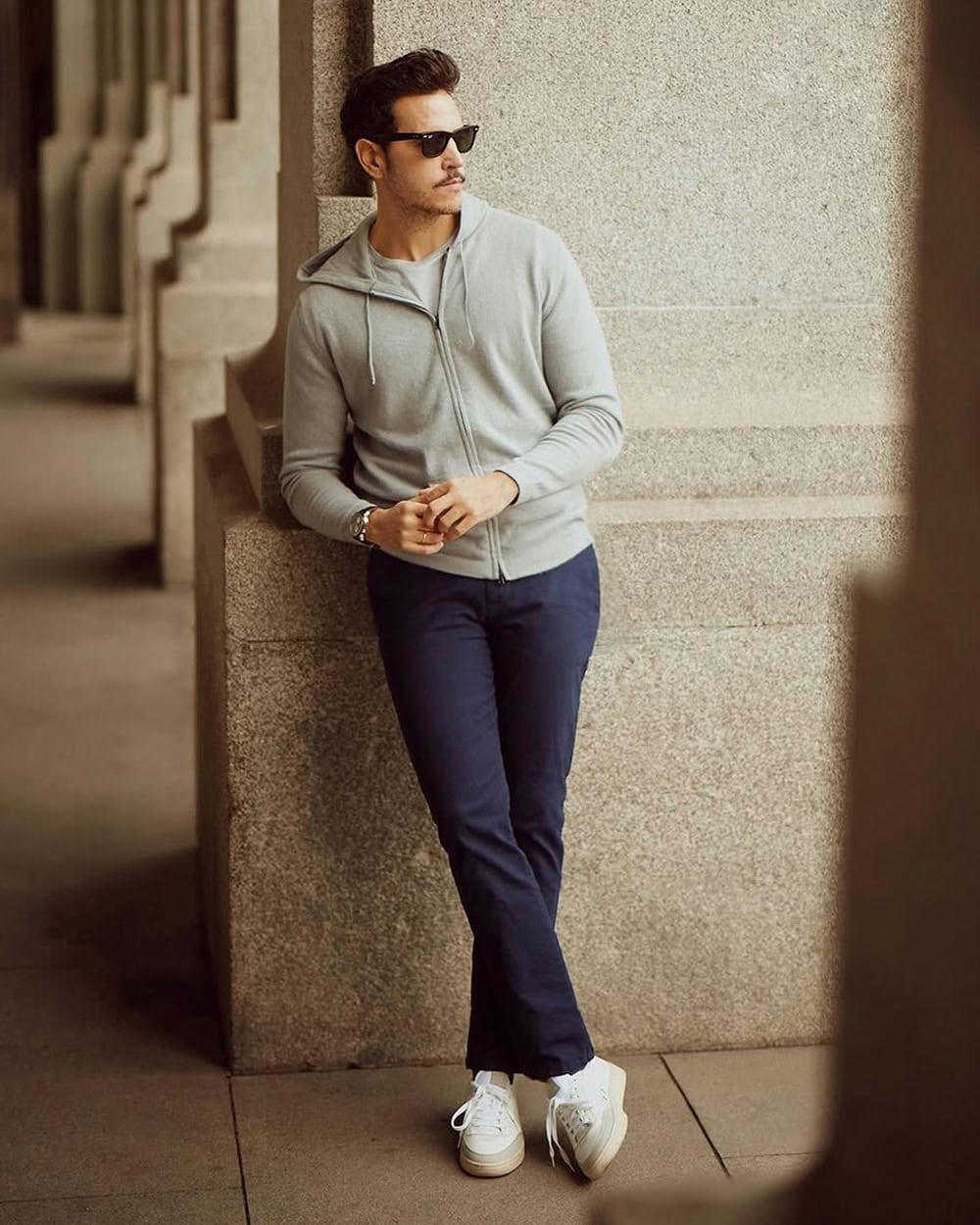 Anything from jeans to joggers can work, enabling you to add a bit of refinement to even the most sloppy of get-ups.