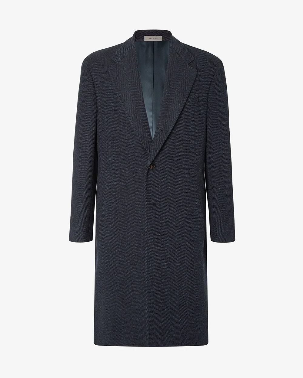 - Blue wool and cashmere coat with herringbone pattern