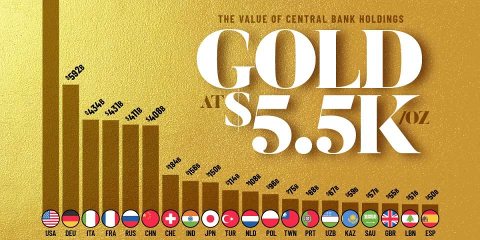 Central Banks Ranked by the Value of Their Gold at $5,500 an Ounce