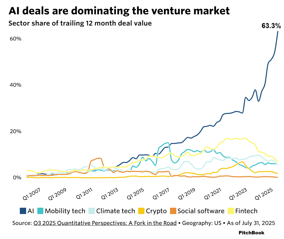 AI startups represented 63% of all venture capital investments made in the past 12 months, a jump from 40% at the end of Q3 2024, and from 23% at the end of Q3 2020 (as illustrated by the blue line in the chart), according to PitchBook’s Q3 2025 Quantitative Perspectives: A Fork in the Road.