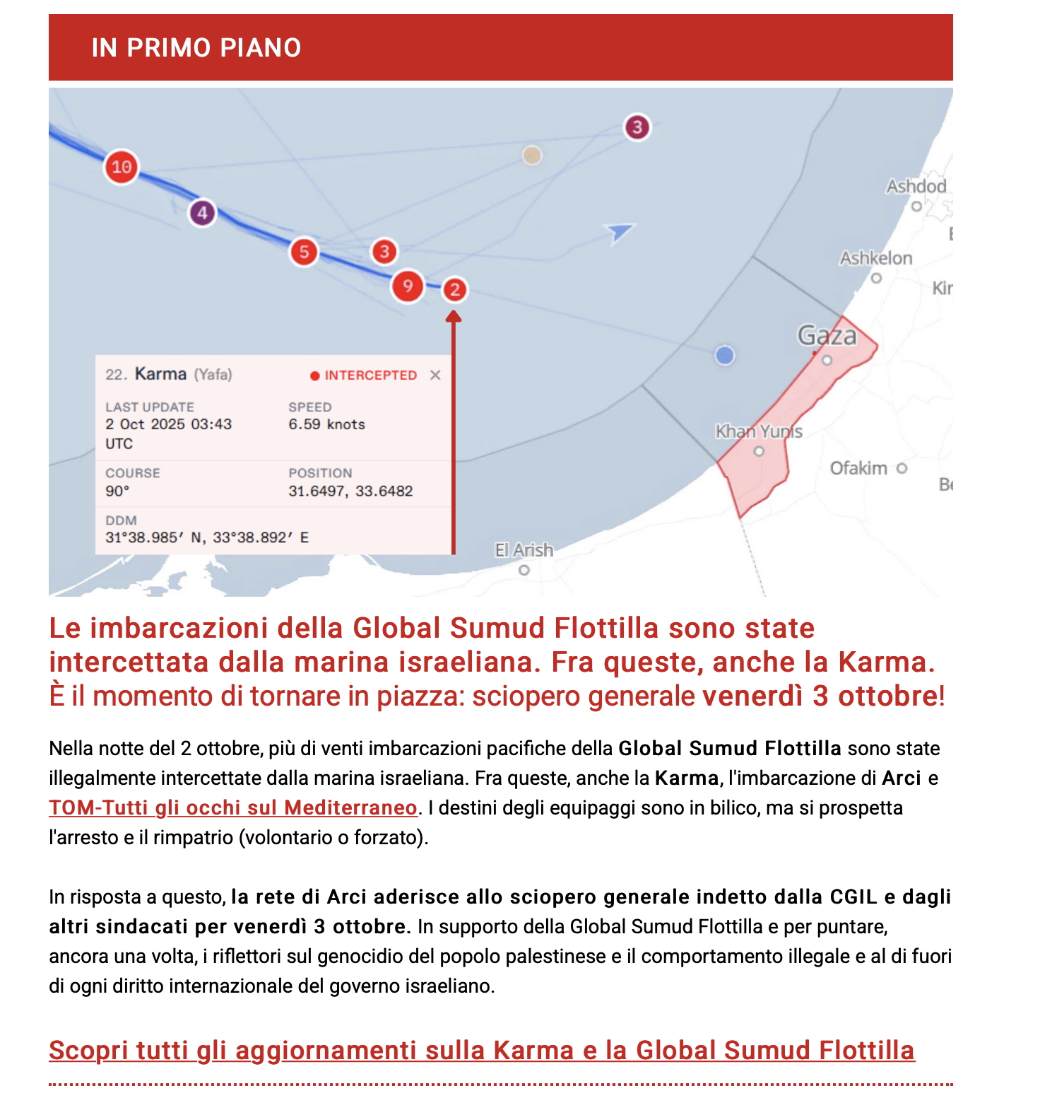 I’m sharing a screenshot from Arci’s latest e-blast, an association established by communists serving as an umbrella for cultural institutions and social groups. The Karma is the boat supported by Arci.