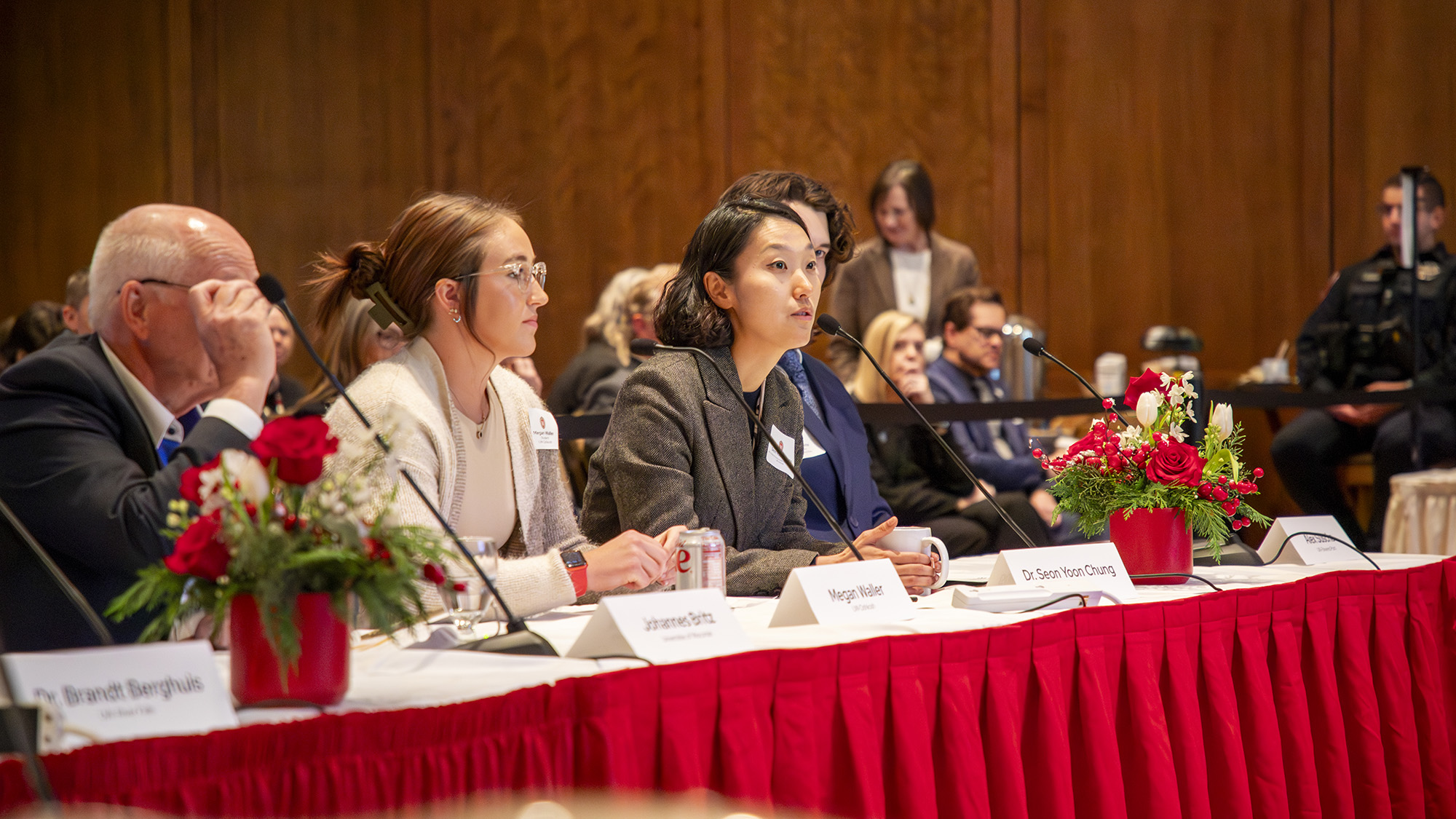 UW-Oshkosh junior nursing student Megan Waller (in white) and Seon Yoon Chung, right, address the Universities of Wisconsin Board of Regents in a panel discussion about innovative uses of artificial intelligence in teaching and learning.