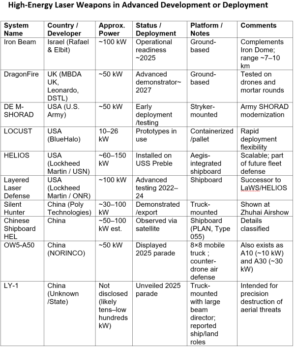 Global military powers are racing to develop and deploy HEL weapons driven by two primary factors: 1) advancements in technology that enable effective targeting and neutralization of aerial threats, and 2) the increasing risk of drone attacks overwhelming traditional defensive measures. The synergy of high laser power, automated aim control, and improved thermal and power integration has elevated HELs from mere laboratory experiments to operational tools ready for installation on naval vessels and land-based air defense systems. Conversely, the rise of precision-guided drones presents a significant challenge on the battlefield. The capability of low-cost drones to overwhelm standard defenses necessitates a new category of weapon that is not constrained by a finite supply of kinetic munitions. HELs, with their rapid firing rate and virtually limitless “ammunition,” fulfill this need. Currently, Israel and China are leading the HEL arms race, with operational deployments anticipated this year, and other nations are likely to follow closely behind.