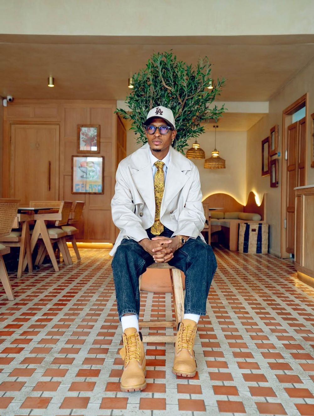 Monare’s fashion incorporates modern streetwear elements paired with tailored pieces, creating a look that embodies both relaxation and refinement.