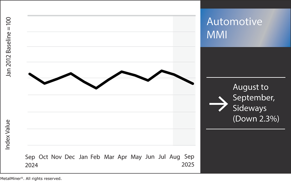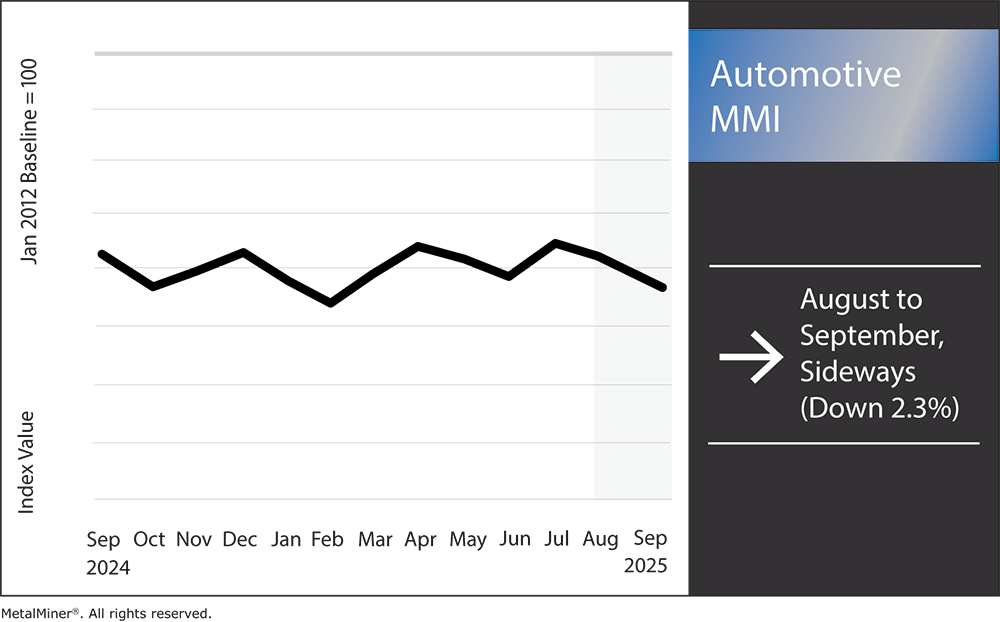 The Automotive MMI (Monthly Metals Index) saw a slight decrease of 2.3%. This decline occurs amidst rising costs and the threat of shortages in the metal supply chains that U.S. manufacturers are facing. Such challenges are largely attributed to steep tariffs on steel, aluminum, and other essential materials, which are increasing raw material expenses.